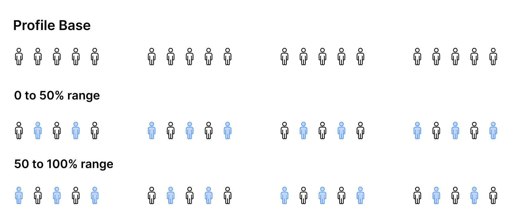 • Range defines the portion of the database to which segmentation conditions will be applied. By default, the range is set to 100%, meaning that if there are 1000 profiles in the database, segmentation conditions will be applied to all profiles in the database. For example, if you set the range from 10% to 50%, the conditions will be applied to approximately 400 profiles, evenly selected from the entire database.