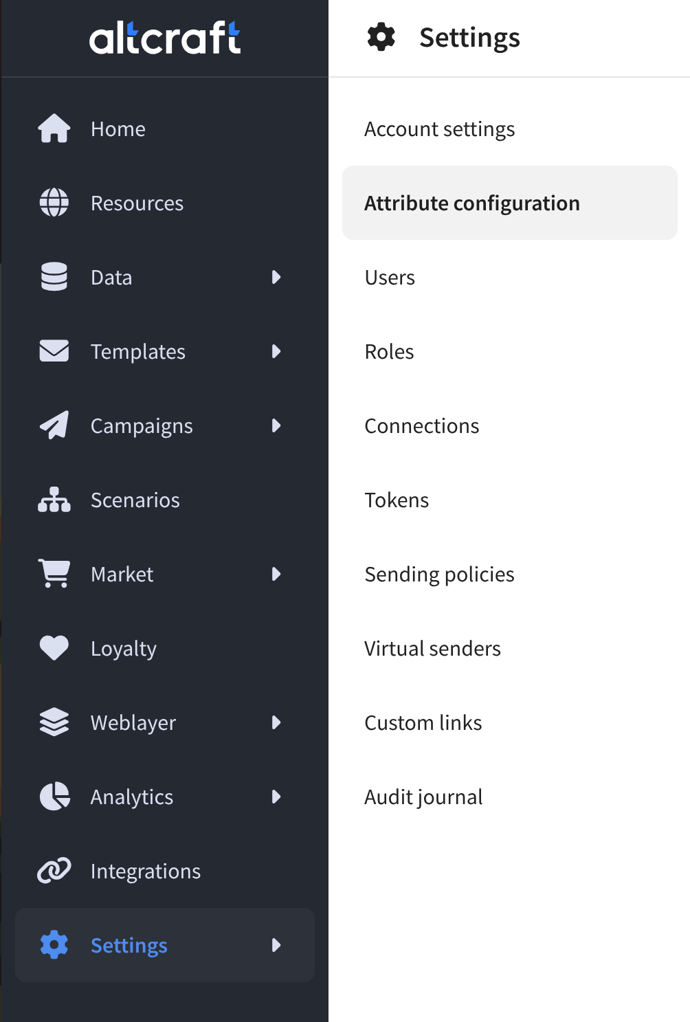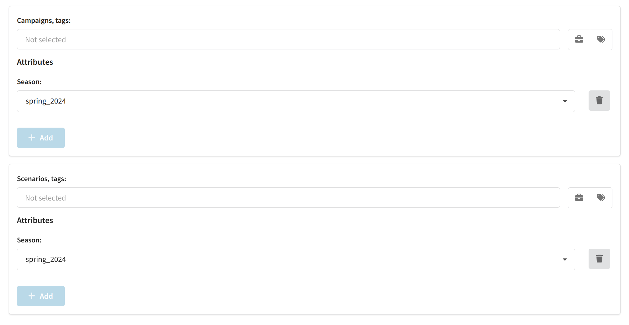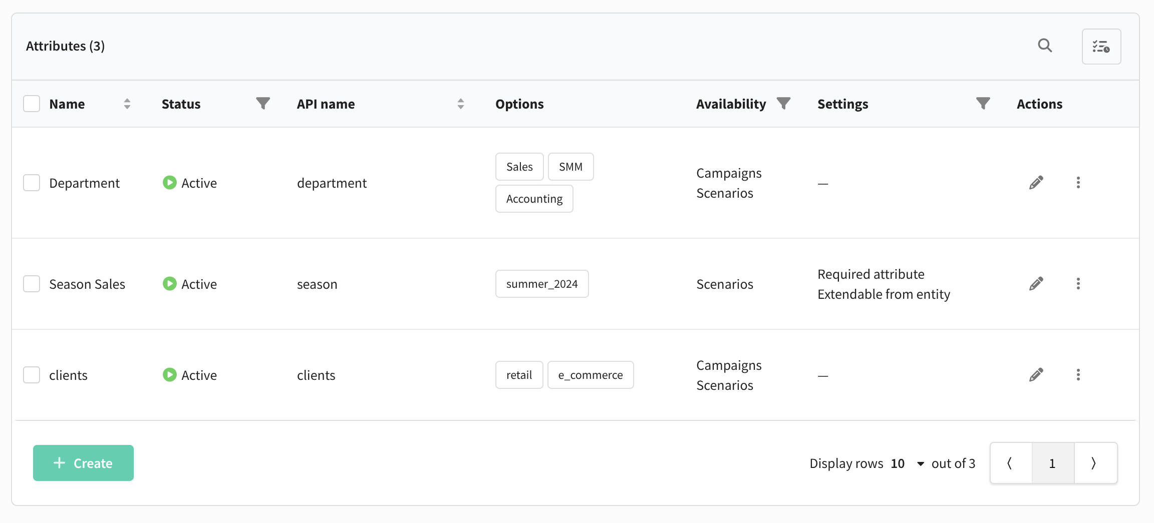 Attributes are custom user-defined fields that can be added to platform entities. They represent a specific parameter with a set of possible values. Attributes can be used not only to tag specific groups of entities for search, but also as segmentation criteria, variables, or embedded into API requests. Attributes can be assigned to both campaigns and scenarios.
