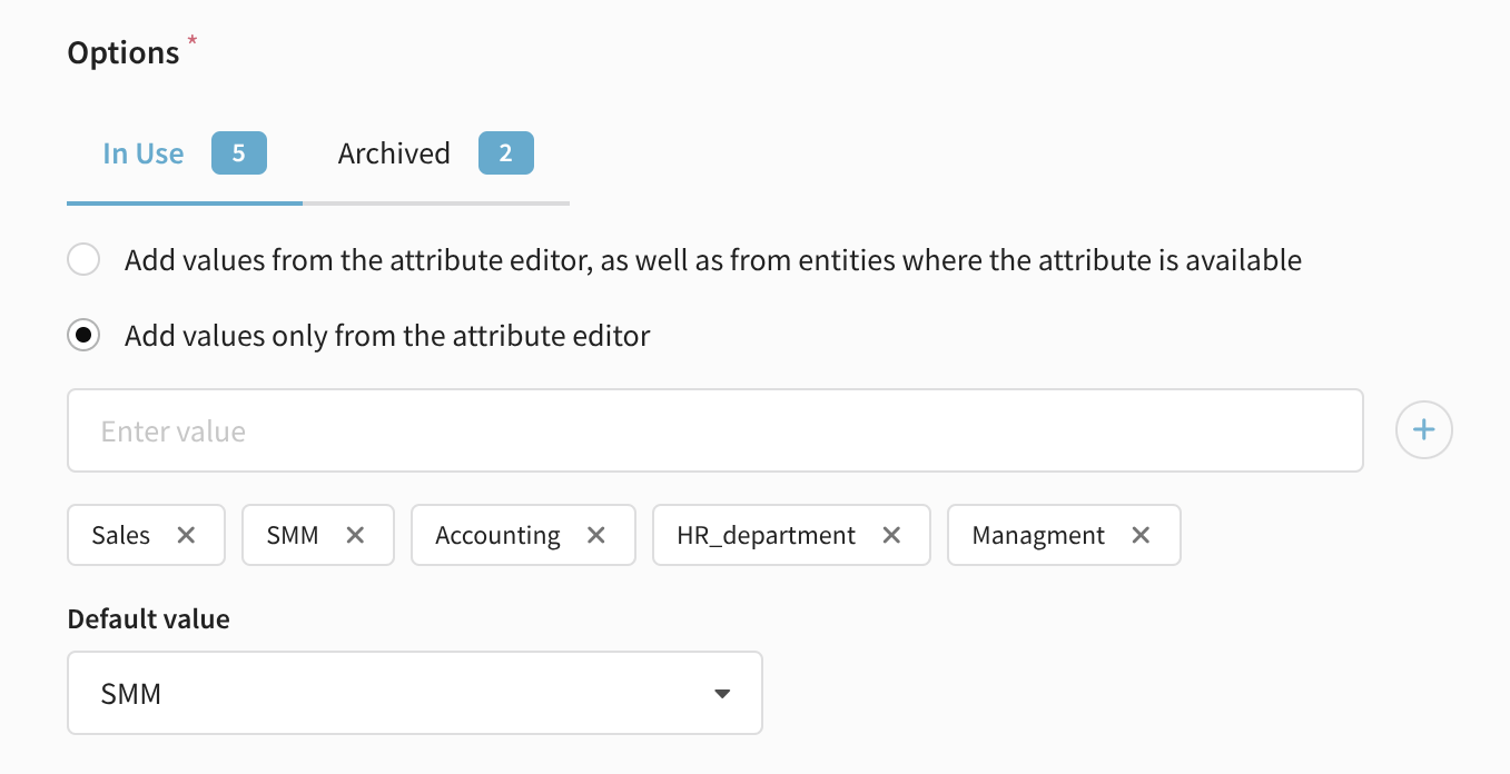 Later, values can be not only deleted, but also archived. Archived values cannot be assigned to new entities but remain available for existing ones and can be used in filters and search. Archived values are marked accordingly: