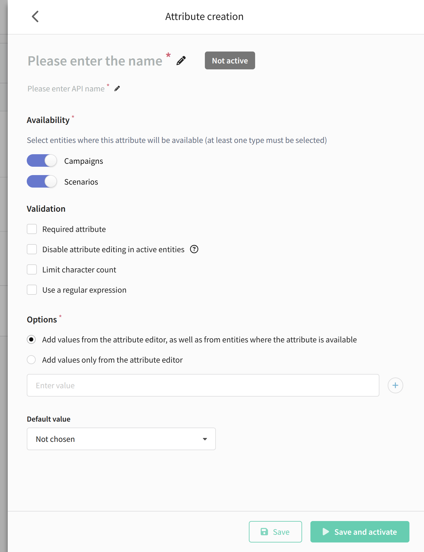A configuration window will appear. First, specify the name and the API name for the attribute. Then select the entities the attribute will be available for — campaigns or scenarios (at least one type is required):