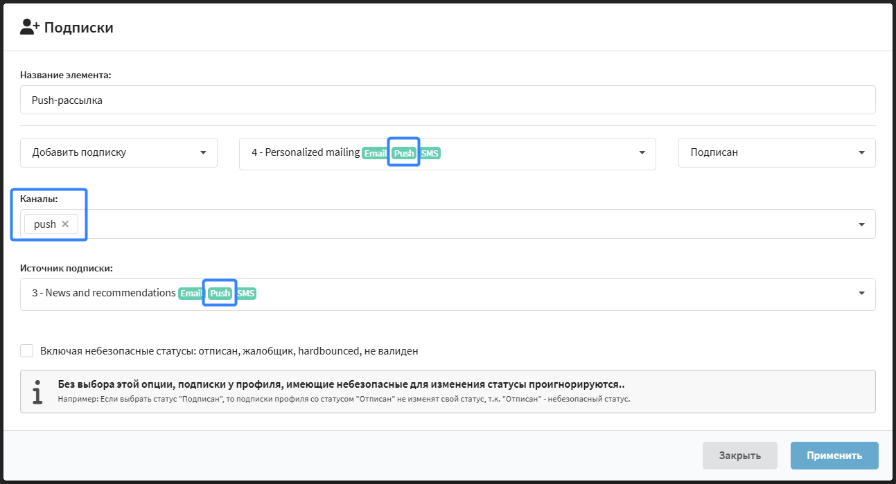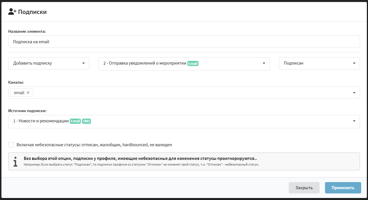 Подписка на новый канал в ресурсе — добавлена подписка на новый (для профиля) канал в ресурсе. То есть, была подписка на email рассылки, добавилась ещё и на SMS или Push.