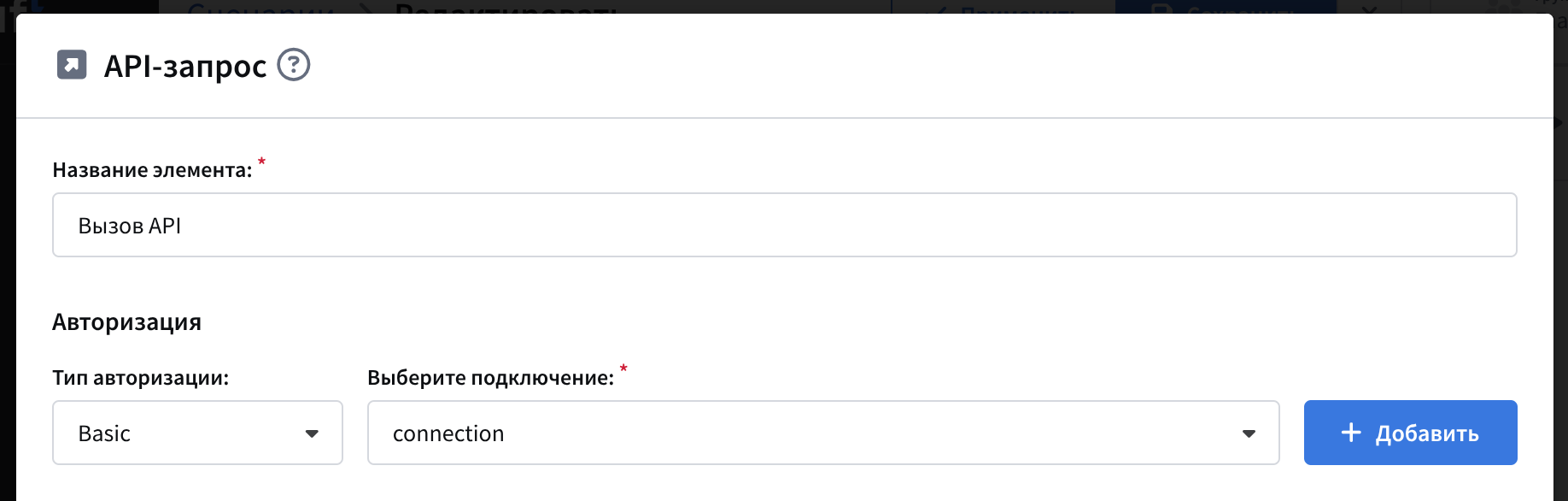 Чтобы добавить узел в сценарий, нажмите кнопку "+ Элемент" на панели инструментов. В открывшемся списке нажмите на необходимый элемент или перетащите его на рабочее пространство, удерживая левую кнопку мыши.