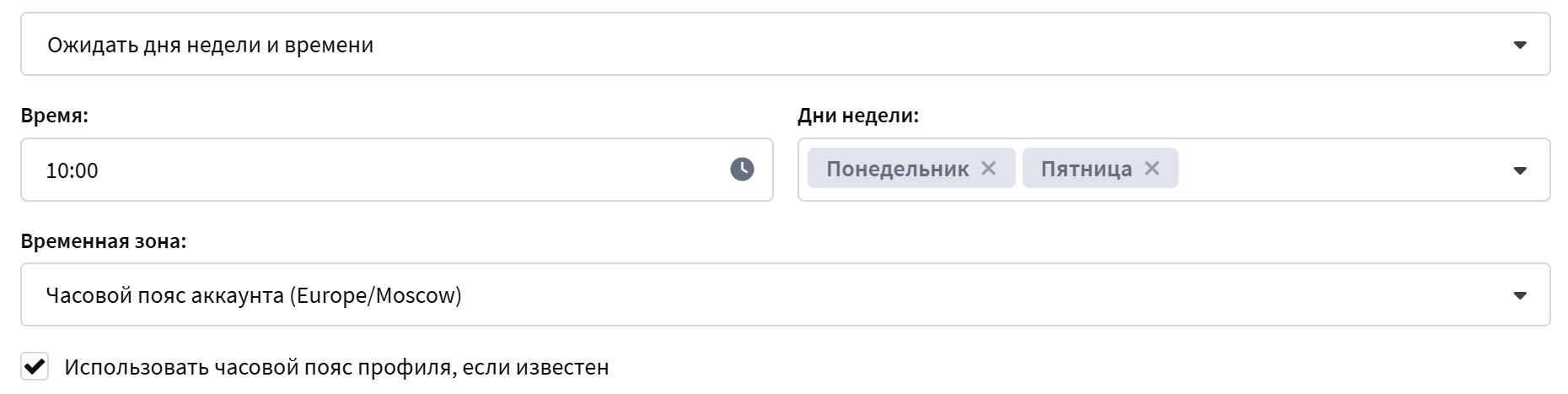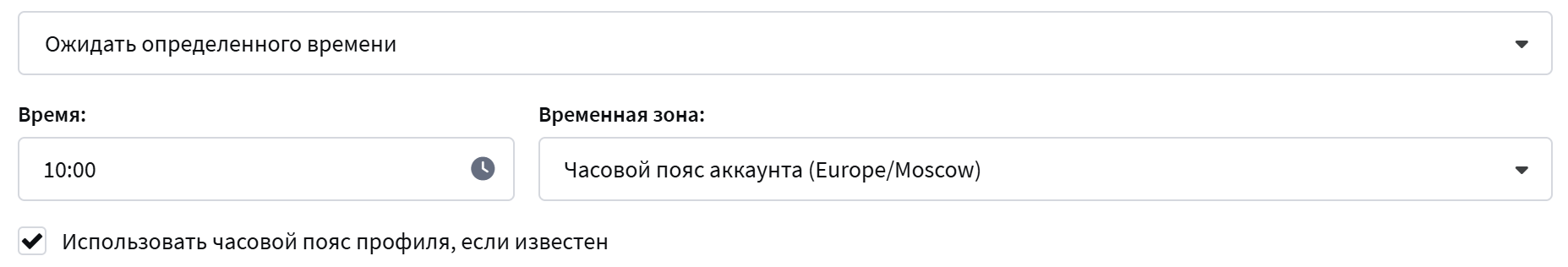Эти варианты ставят сценарий на паузу до наступления определённого времени суток — в ближайшее выбранное время, в конкретную дату, в ближайший день недели. Причем, если известен часовой пояс профиля, его тоже можно учитывать.