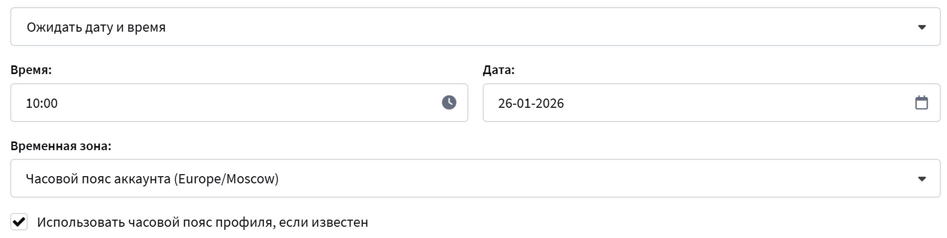 Ожидать дату и время из профиля — профиль перейдет на следующий узел, когда наступит даты и время, указанные в выбранном поле.