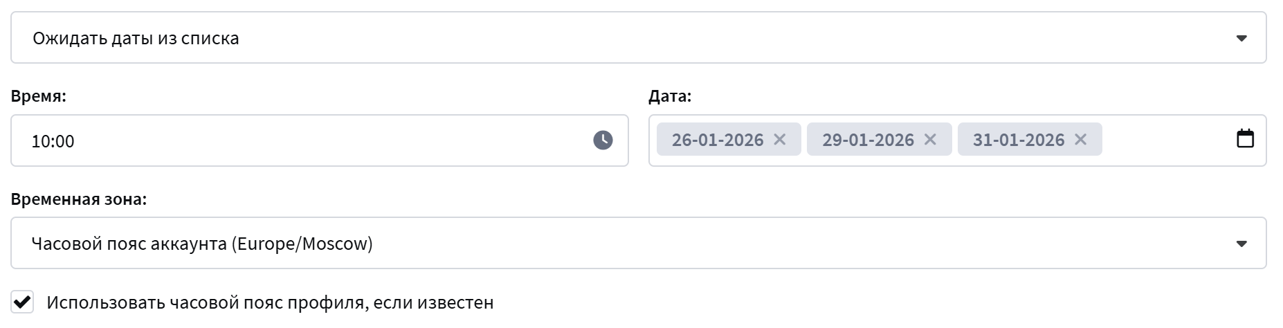 Предположим, вы установили следующие даты: "2023-02-01", "2023-07-01" и "2023-10-01". Если профиль попал на узел 1 января 2023, то он продолжит движение по сценарию 1 февраля. Если профиль попал на узел 1 марта 2023, то он пойдет дальше 1 июля. Если же профиль попал на узел в августе, то он будет ожидать до 1 октября. Каждый профиль единожды ожидает до ближайшей к моменту попадания на узел даты.