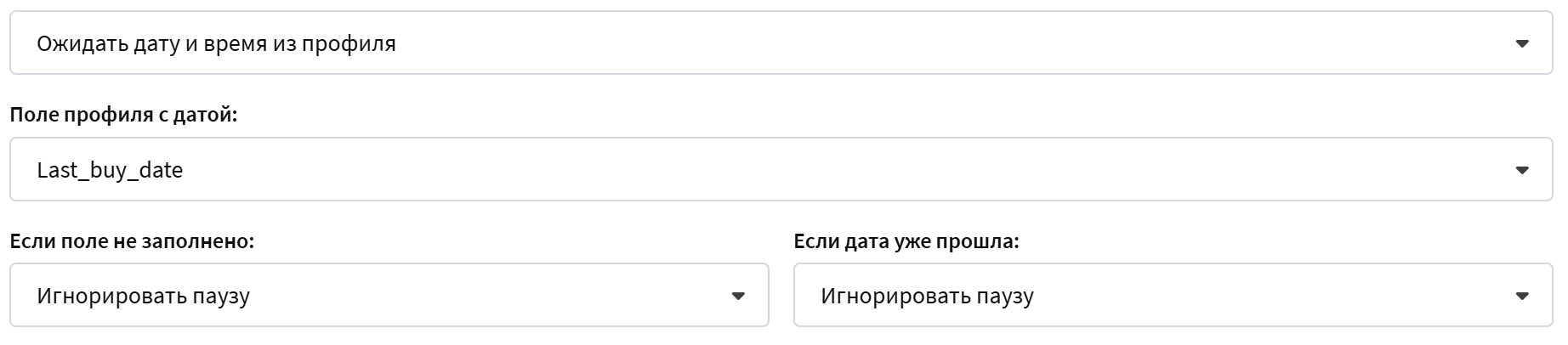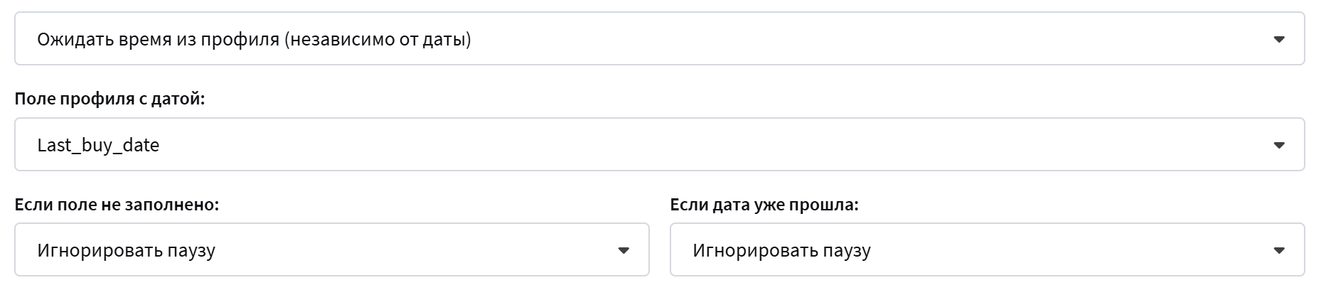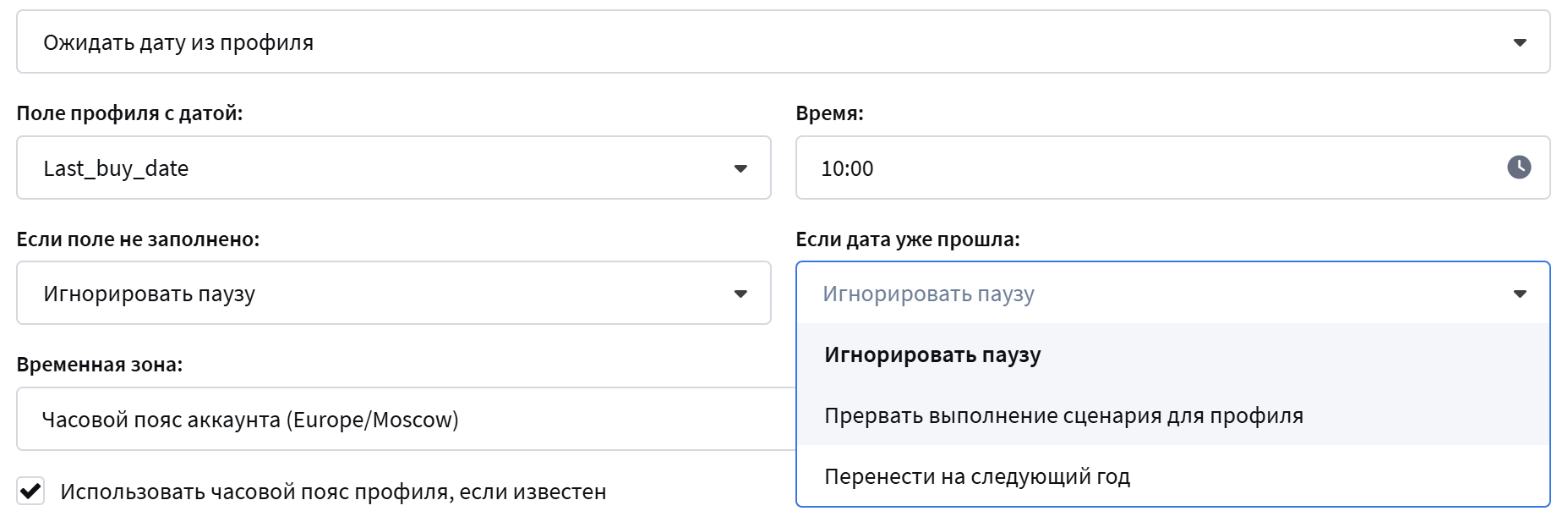 Эти настройки позволят поставить сценарий на паузу до наступления даты или времени, которые указаны в одном из полей профиля: