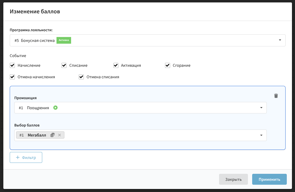 Вы также можете добавить фильтр, чтобы выбрать промоакцию и вид баллов, для которых будет срабатывать этот триггер.