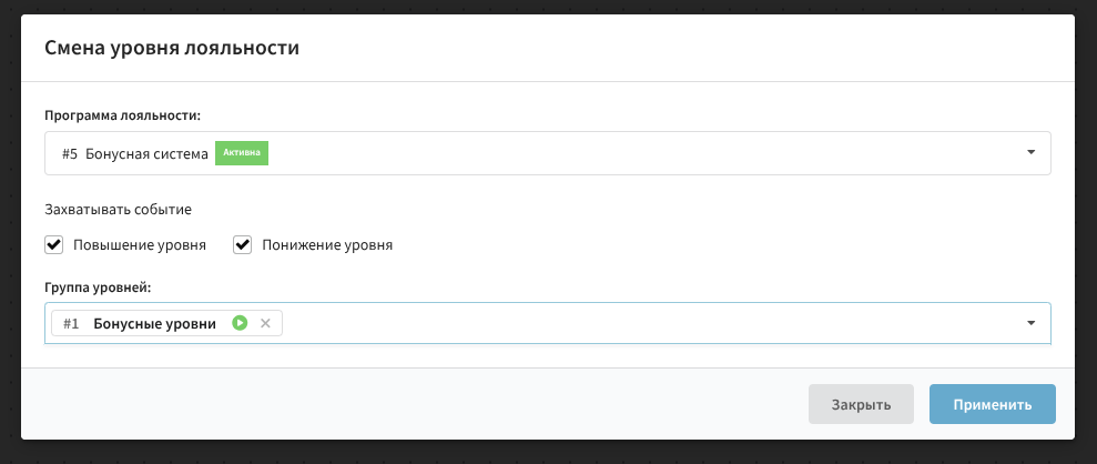 Для настройки триггера выберите заранее созданную программу лояльности и группы уровней. Вы можете настроить срабатывание триггера при повышении, понижении или любом изменении уровня.
