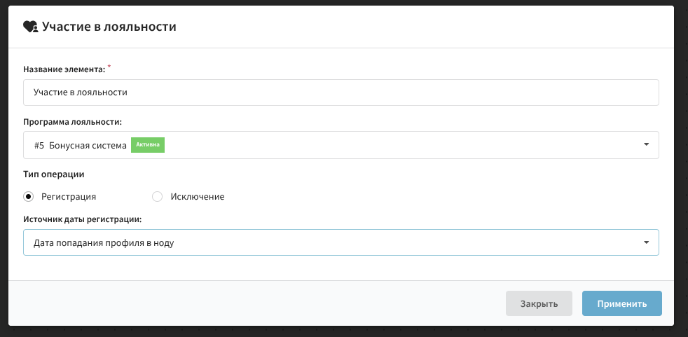 Для настройки триггера выберите заранее созданную программу лояльности и действия, которые будут активир овать триггер: