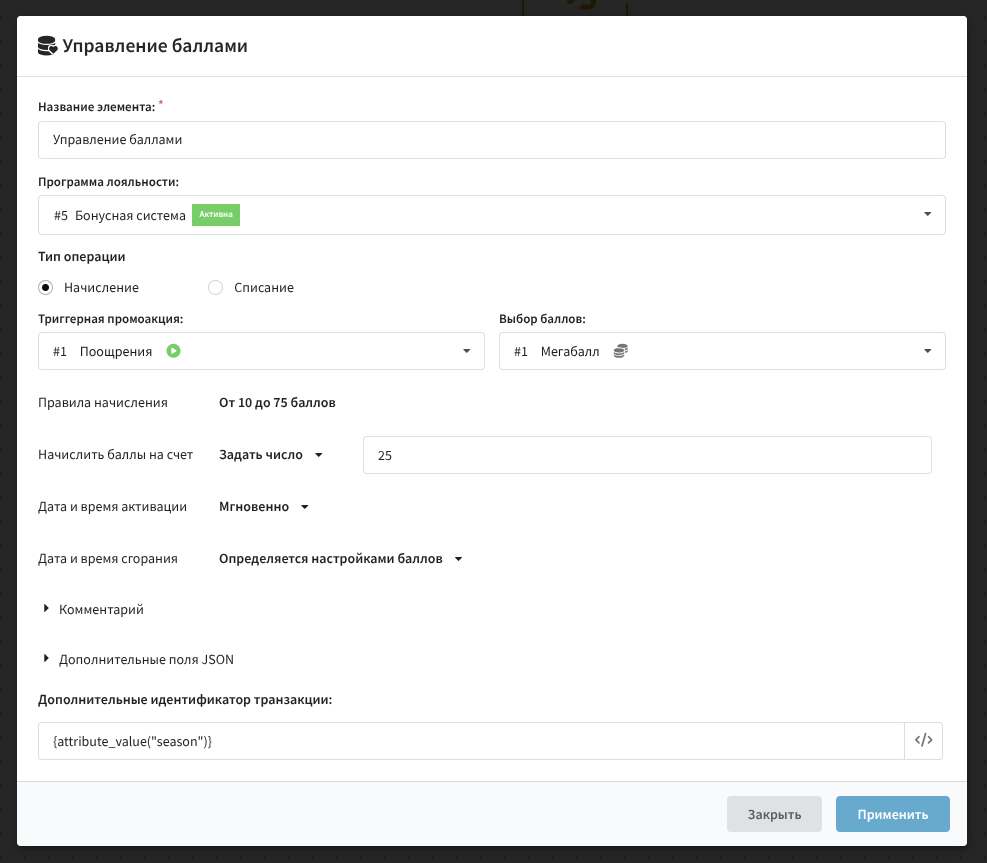 ![]() | Триггер активируется, когда у профиля изменяется количество баллов в программе лояльности. |