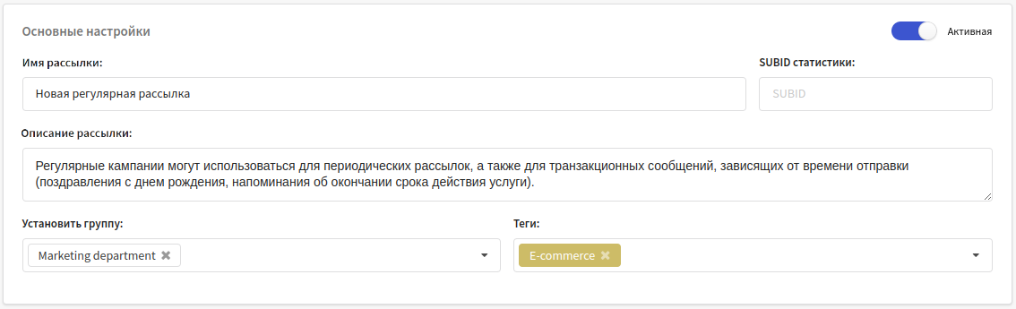 В основных настройках укажите название и описание новой рассылки, при необходимости установите группу доступа, теги и атрибуты для дополнительной группировки. Здесь же вы можете указать SUBID статистики для рассылки. В верхнем правом углу находится переключатель, активирующий рассылку: