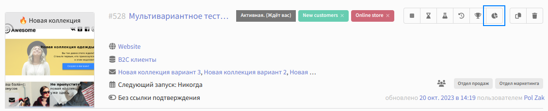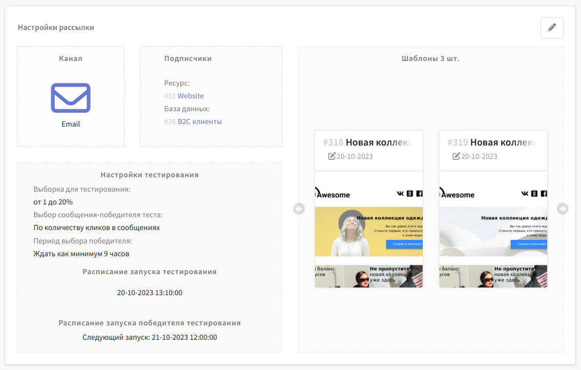 Рассылка после запуска будет автоматически собирать статистику по общему количеству открытий или переходов по ссылкам в шаблонах. Время для сбора аналитики настраивается параметром Период выбора победителя.