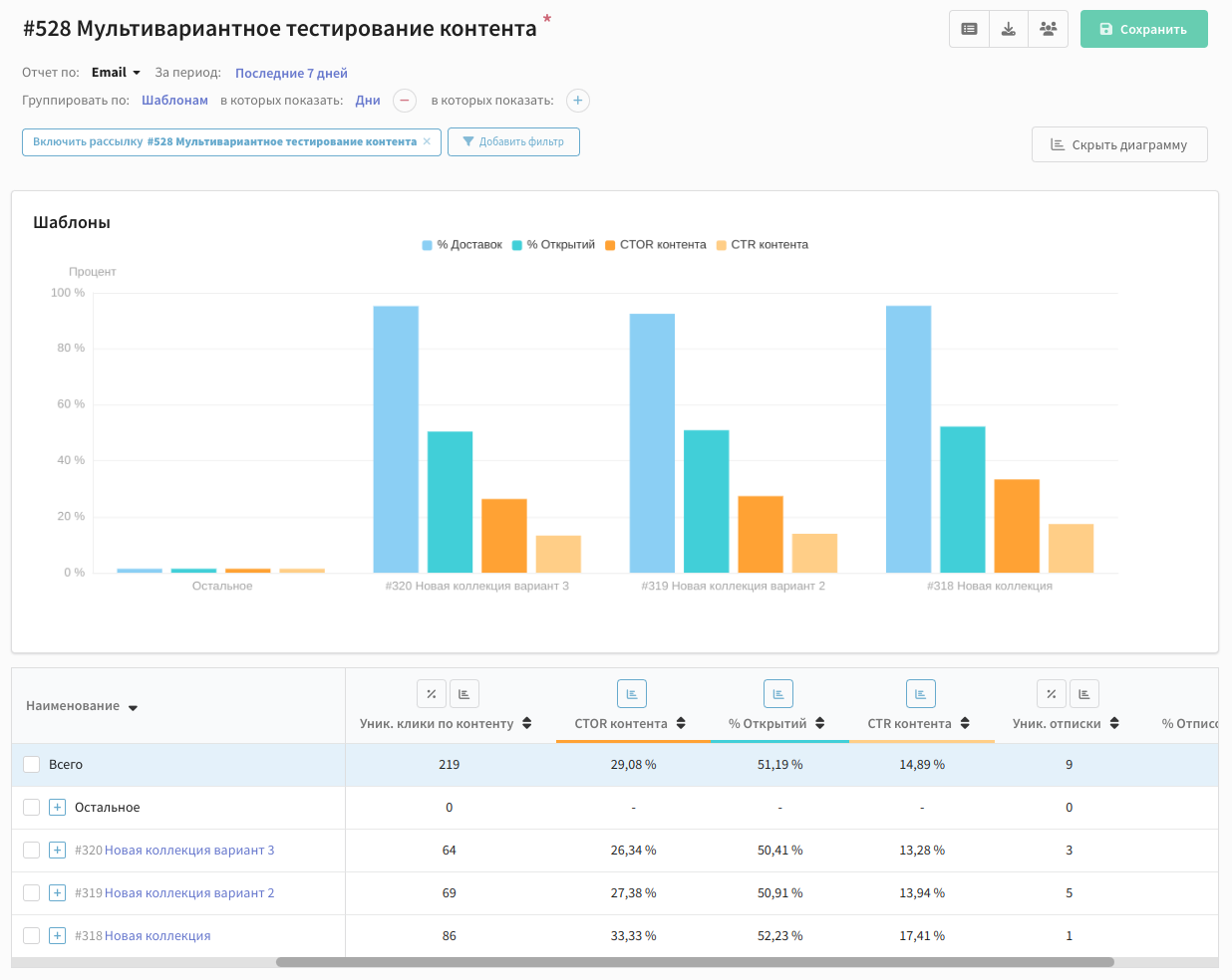 В отчёте выберите необходимые для оценки эффективности параметры. Это могут быть абсолютные или относительные значения (такие как Open Rate или CTR/CTOR). Можно оценить и негативную реакцию по количеству отписок или жалоб: