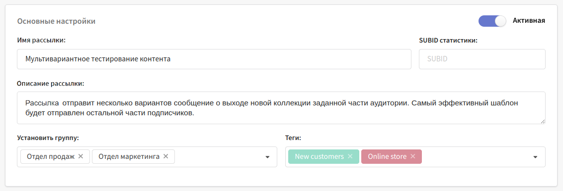 В основных настройках укажите название и описание новой рассылки, при необходимости установите группу доступа, теги и атрибуты для дополнительной группировки. Здесь же вы можете указать SUBID статистики для рассылок. В верхнем правом углу находится переключатель, активирующий рассылку: