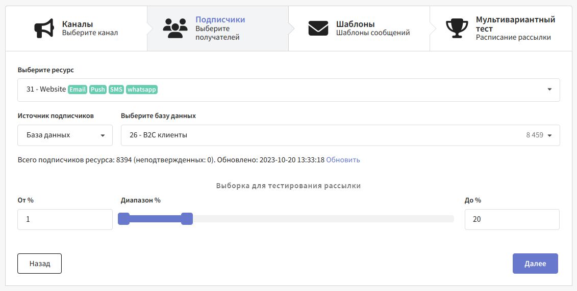 Далее выберите источник подписчиков. Получателями рассылки могут быть профили определенной базы данных или профили, состоящие в сегменте.