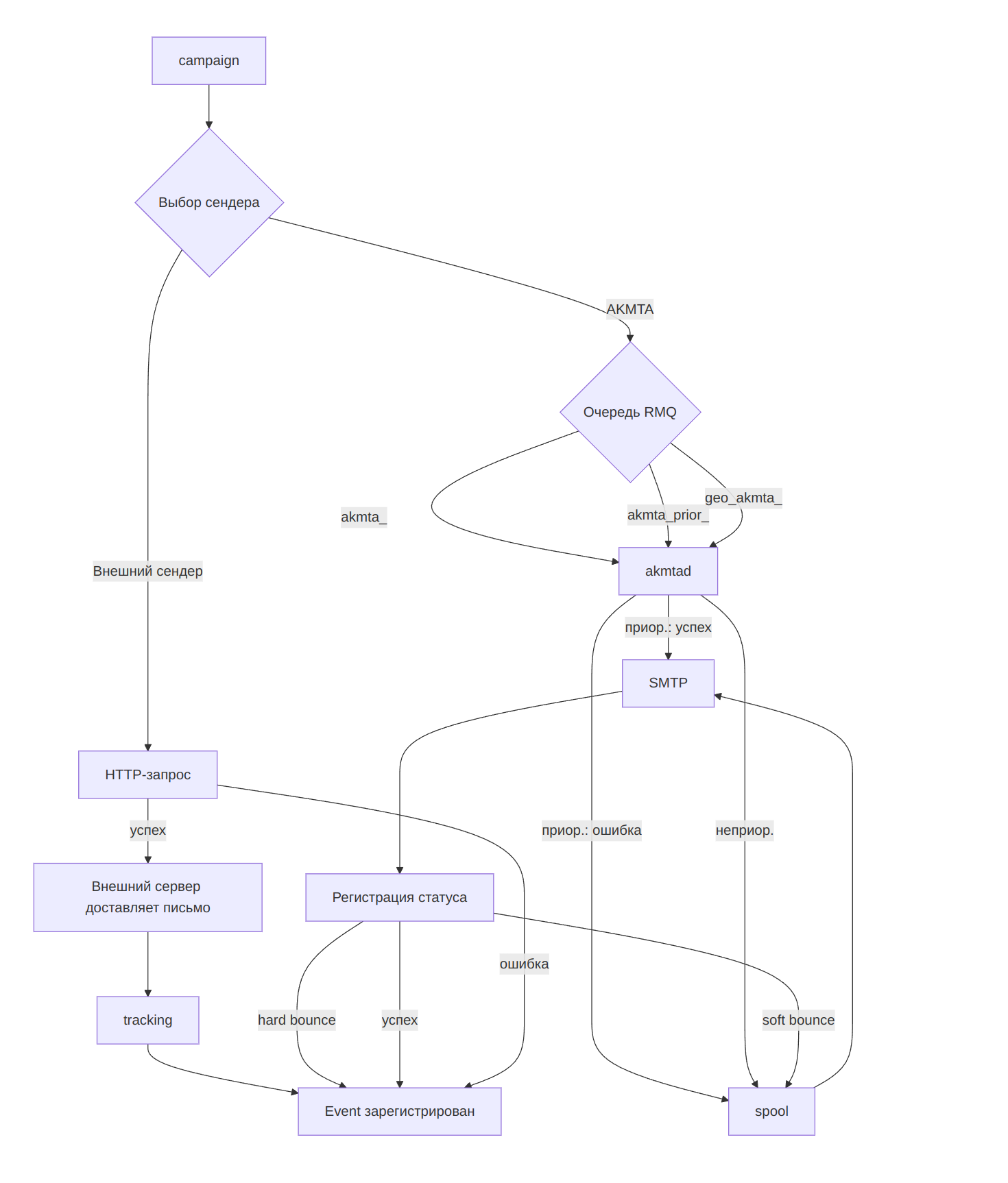 campaign —> Очередь RMQ (akmta / akmta_prior) —> akmtad —> (при неудаче — запись в очередь spool на диске ) —> SMTP