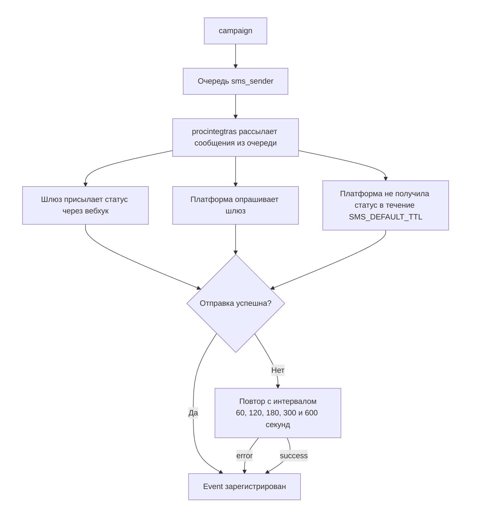 Для остальных сендеров повторные попытки отправки не предусмотрены. В случае ошибки при отправке http-запроса, платформа не производит никаких действий.