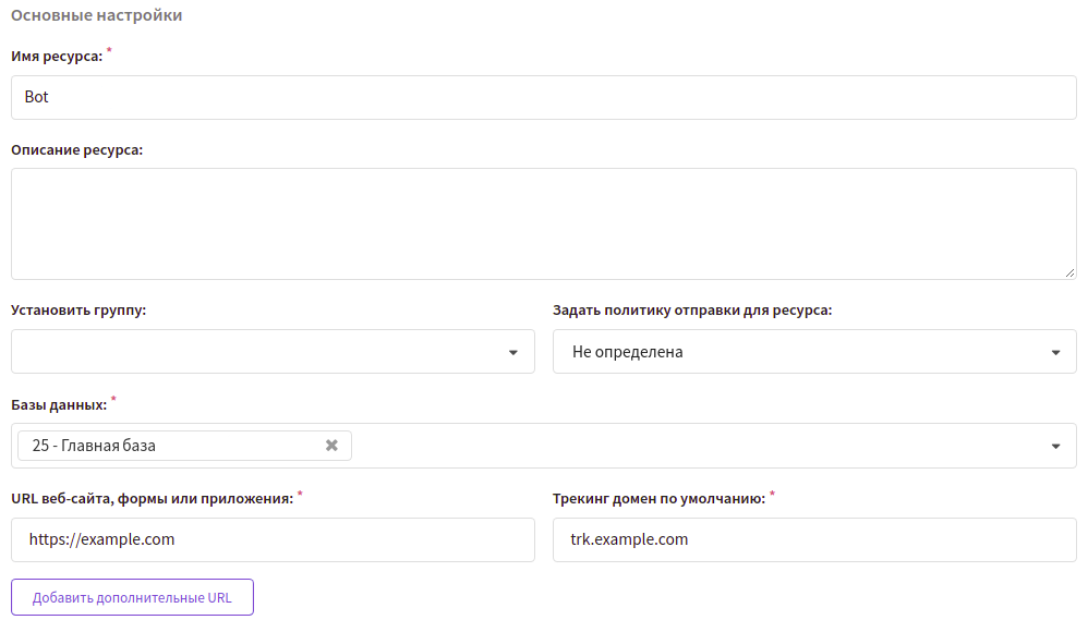В основных настройках добавьте необходимые базы данных. Укажите трекинг-домен по умолчанию, который будет обрабатывать переходы подписчиков по ссылкам в сообщениях MAX-бота: