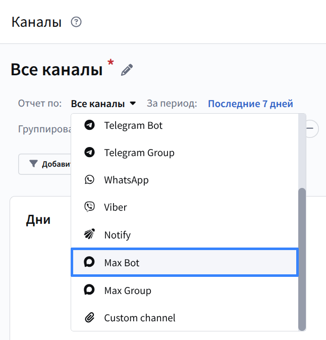 Для группировки по каналу выберите Отчет по: MAX Bot