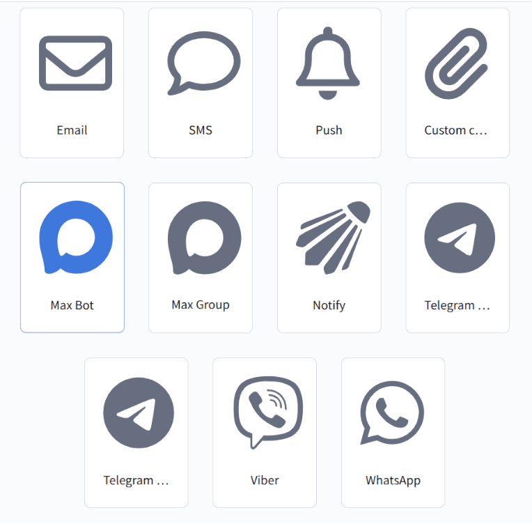 Перейдите в раздел Шаблоны. При создании нового шаблона выберите MAX Bot канал или добавьте этот канал для уже существующего шаблона.