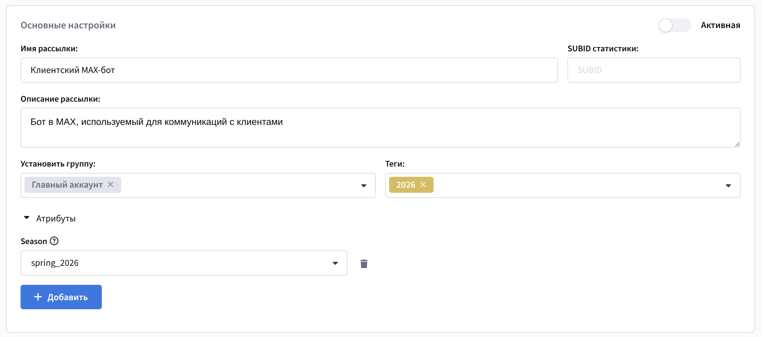 Обратите внимание: со стороны платформы происходит только отправка рассылок. Сбор и передача в платформу данных о пользователях, которые подписались на MAX-бота, в том числе передача user_id осуществляется на стороне клиента. Подробнее о том, как это сделать, читайте в документации MAX.