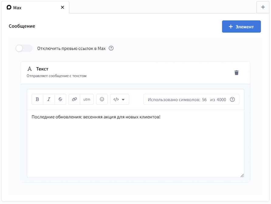 После этого пользователь может получать рассылки. Ниже показано, как настроить такую рассылку через MAX-бота в Altcraft.