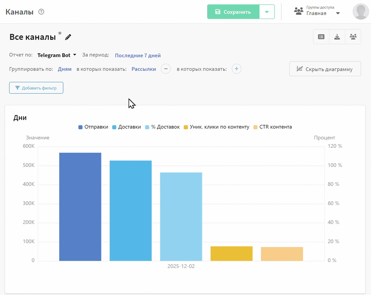 Для получения статистики используйте раздел "Аналитика" по Каналам в главном меню платформы. По умолчанию отобразится отчет по Всем каналам за последние 7 дней. Для группировки по "Telegram Bot" каналу выберите "Отчет по": .