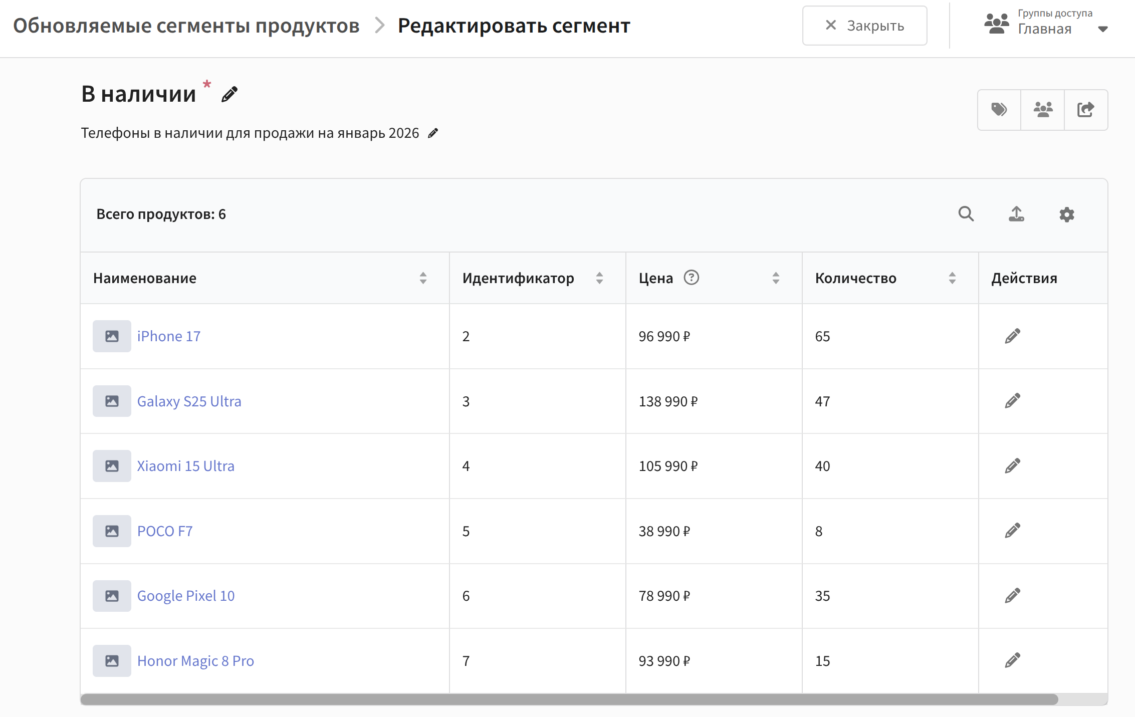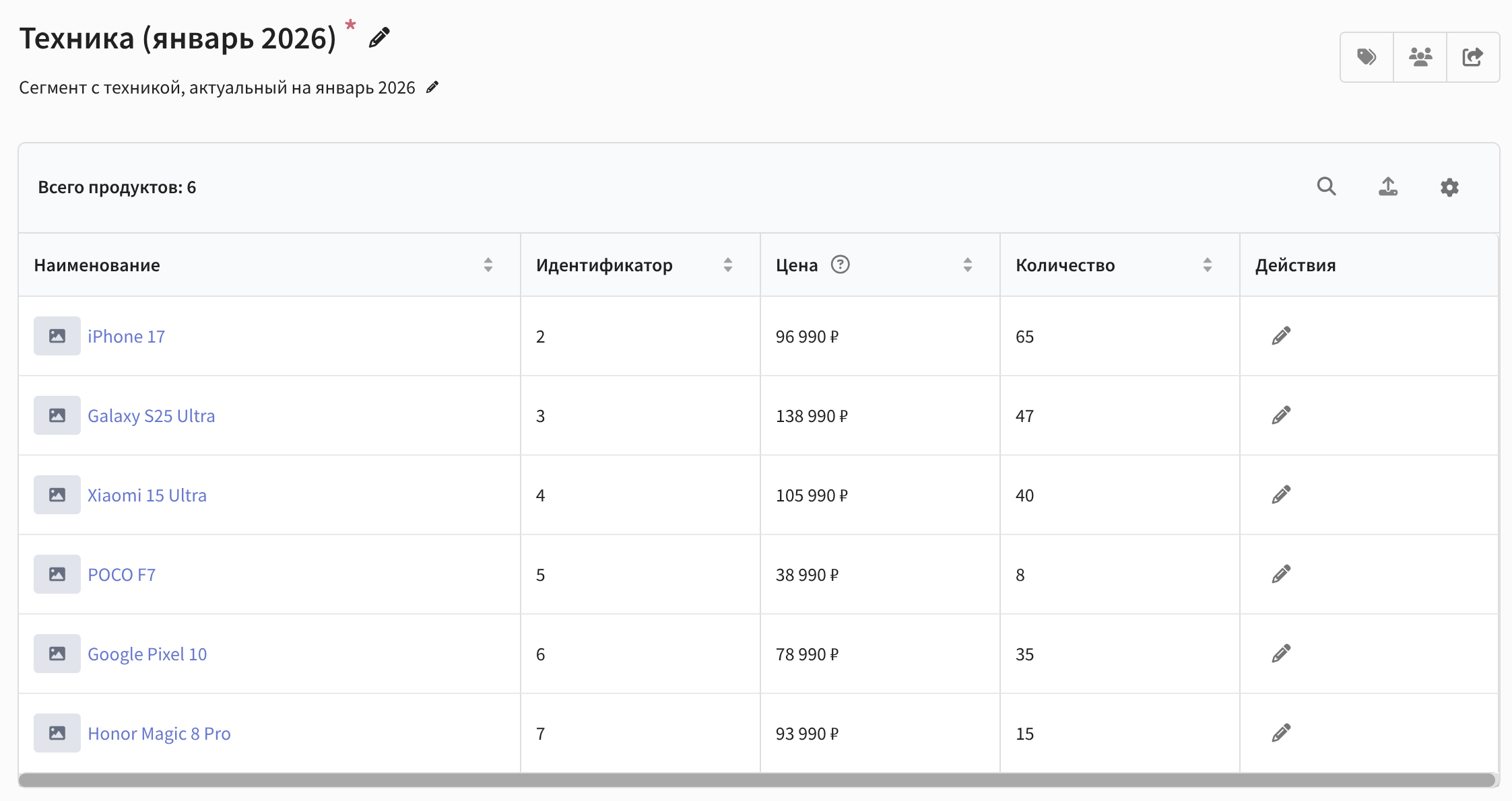 После расчёта в окне статического сегмента отображается таблица со всеми продуктами, входящими в сегмент. В ней отображаются поля "Наименование", "Идентификатор", "Цена", "Количество", а также меню быстрых действий для удаления или переходу к редактированию продукта: