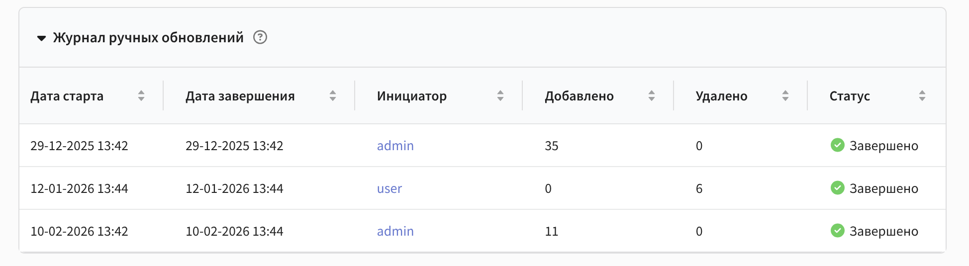 Ниже истории обновлений находится "Журнал ручных изменений". Это детальный лог всех операций, повлиявших на состав сегмента. По каждой операции отображается: