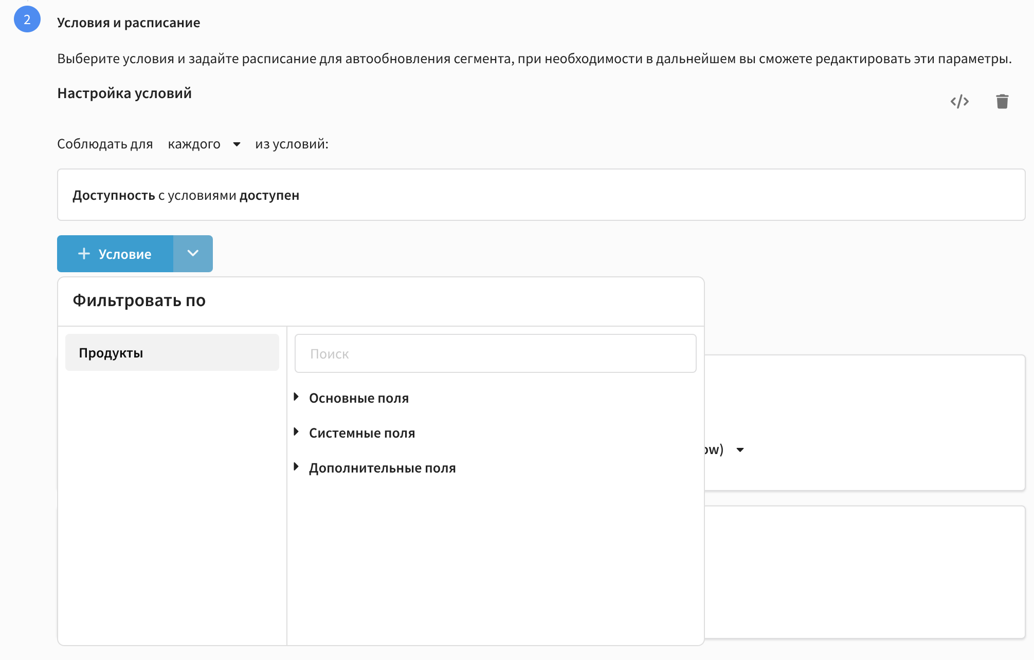 Сегментация продуктов и SKU происходит так же, как и сегментация профилей в платформе. Более подробная информация о конструкторе условий и принципах работы с сегментами доступна в этом разделе.