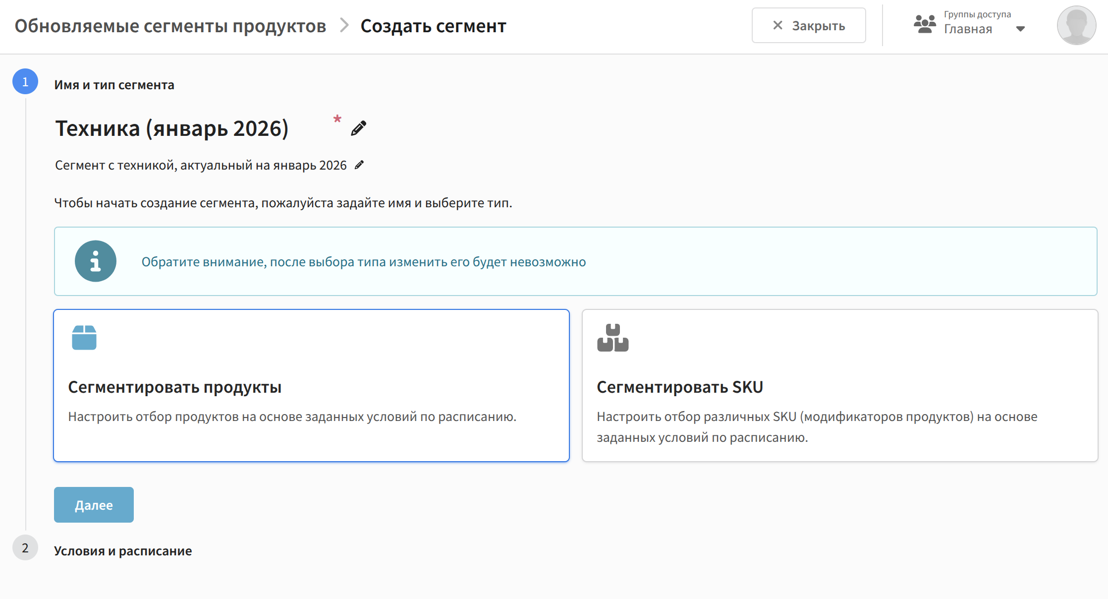 Нажмите "Создать". Укажите название, описание и выберите сущности для сегментации, продукты или SKU. После выбора изменить тип сегмента нельзя: