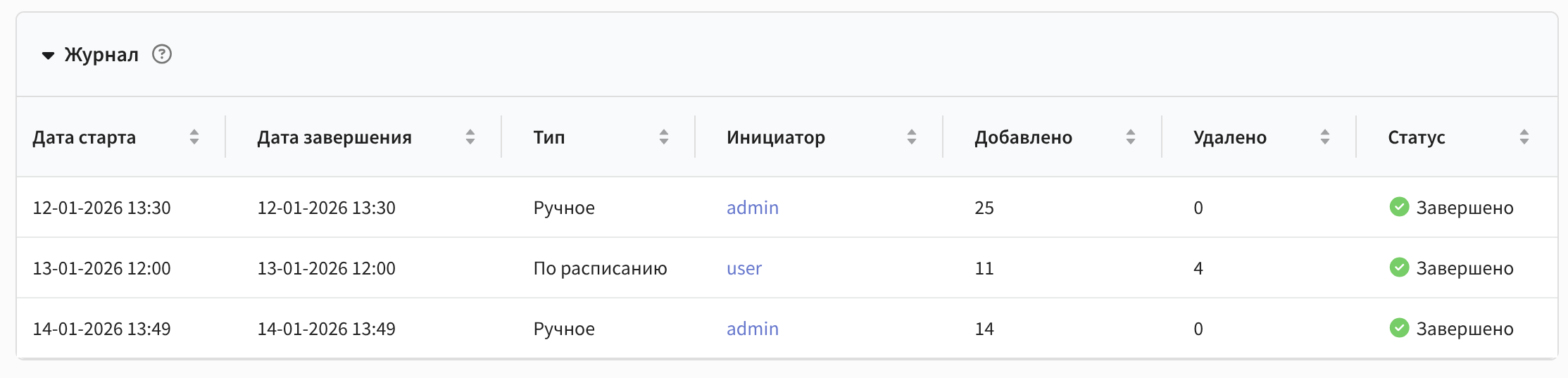 Ниже истории обновлений находится "Журнал". Это детальный лог всех операций, повлиявших на состав сегмента. По каждой операции отображается: