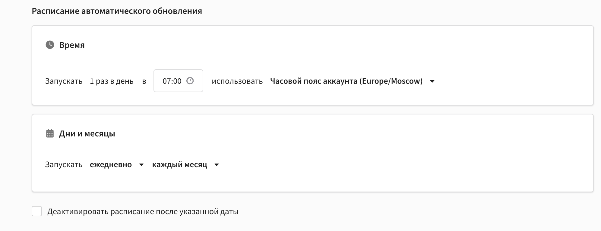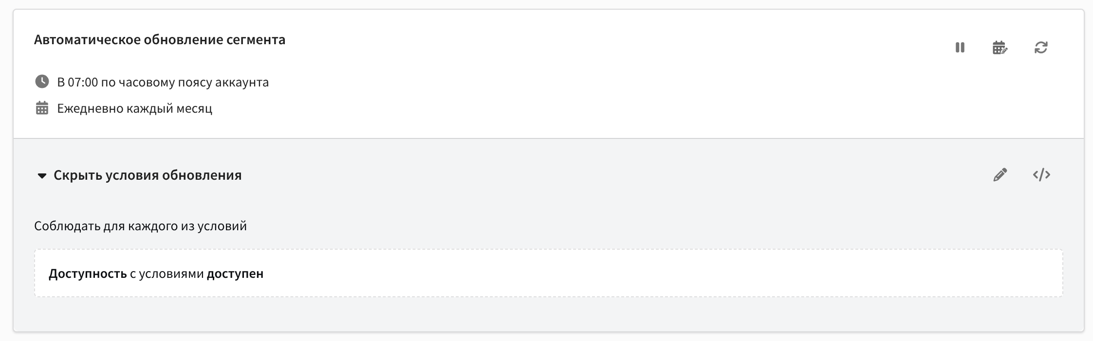 Сегмент может обновляться ежедневно либо в указанные дни. Время обновления и часовой пояс также задаются пользователем: