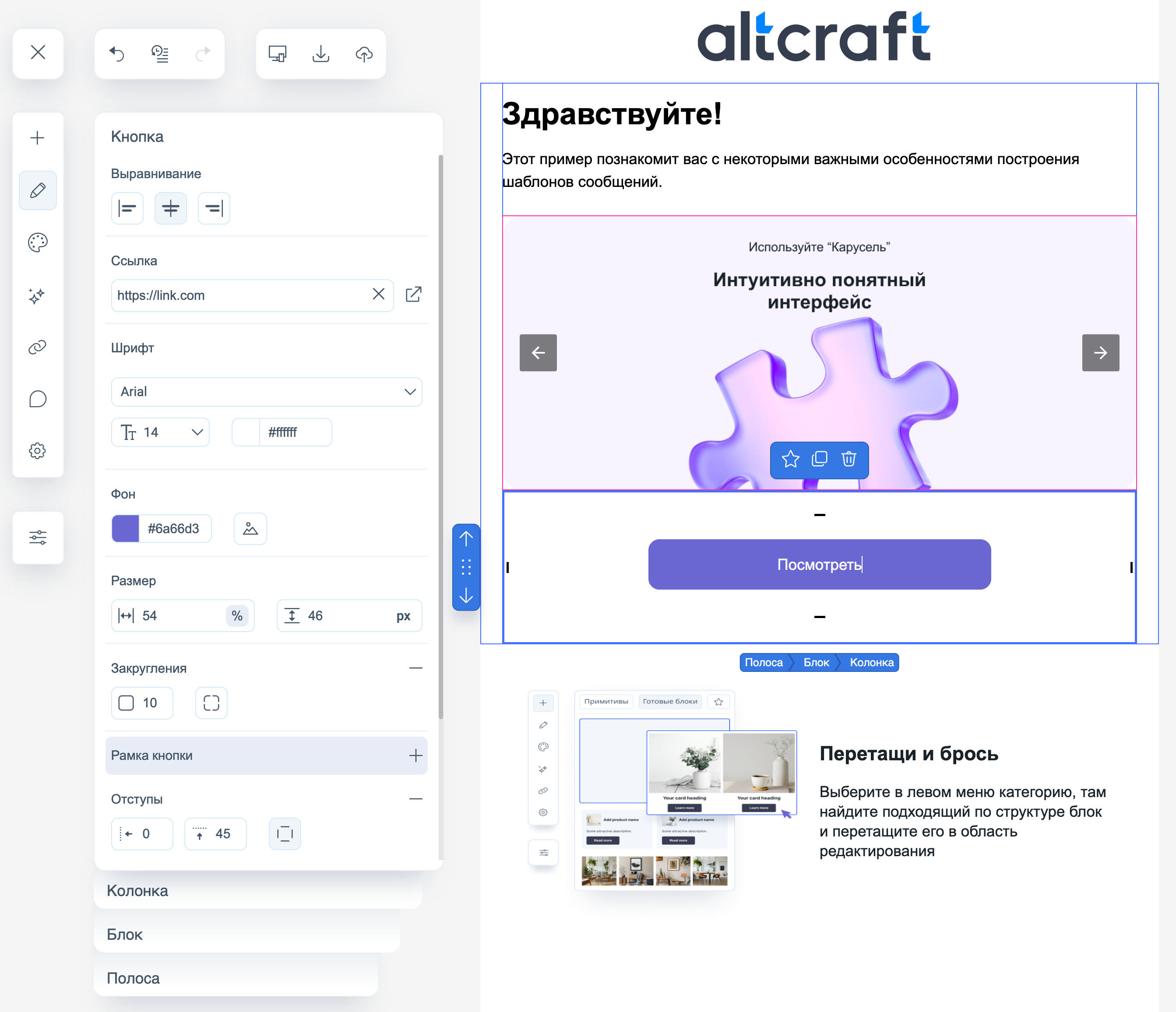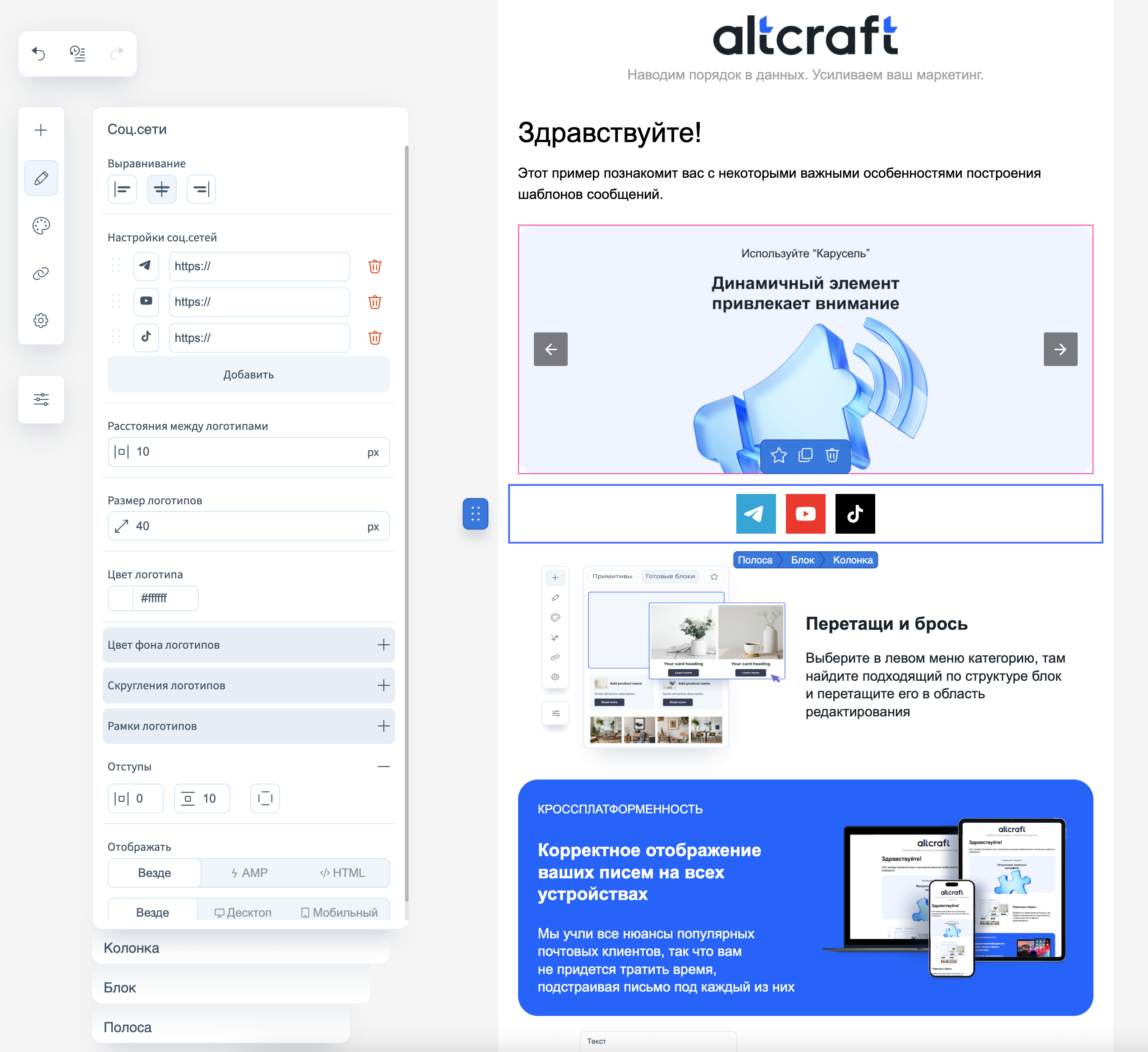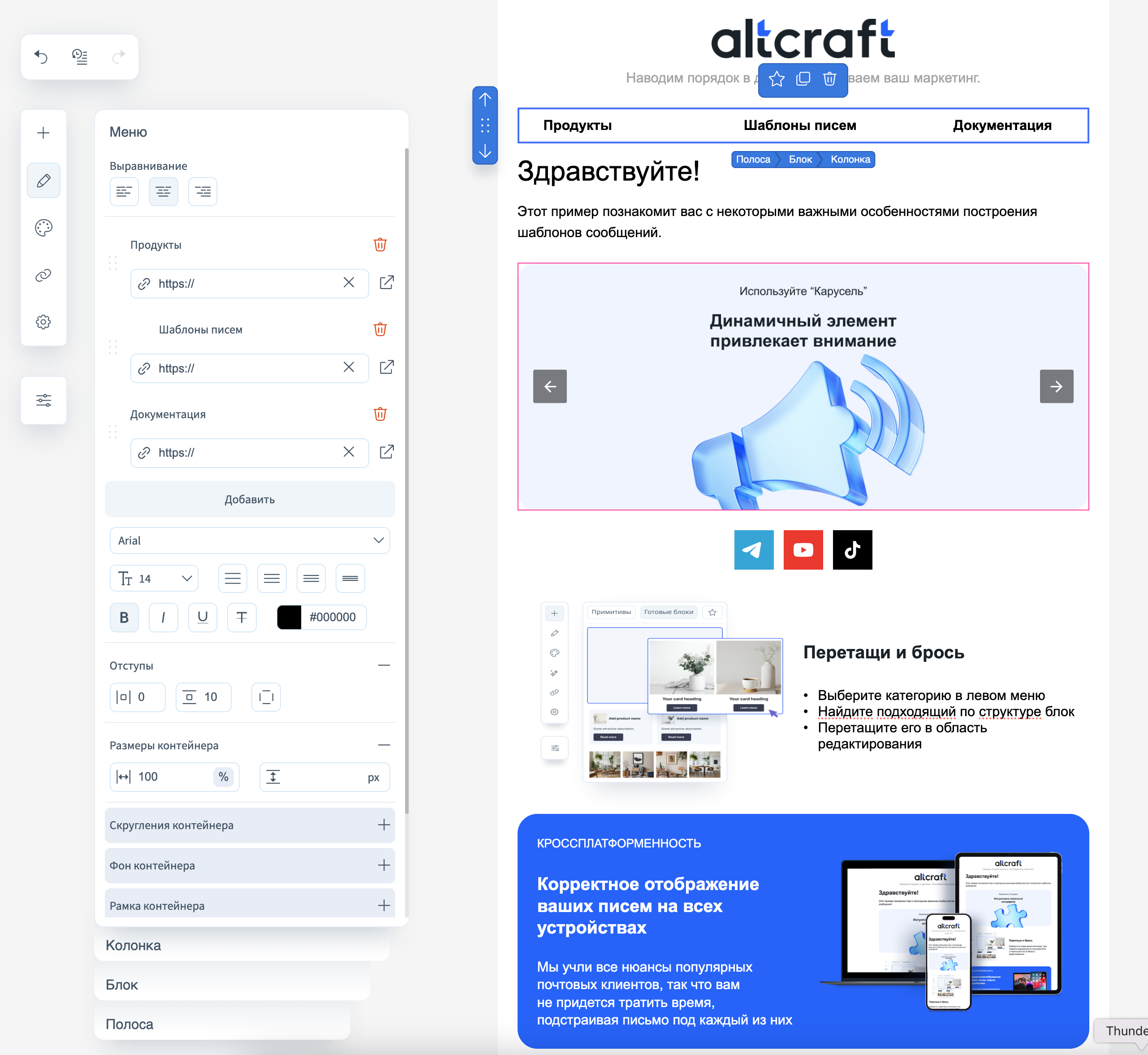 После того как вы создали или открыли шаблон, вы попадаете в редактор писем. Это — основное пространство конструктора. Здесь вы можете добавить новые блоки, изменить свойства компонентов и настроить ссылки.