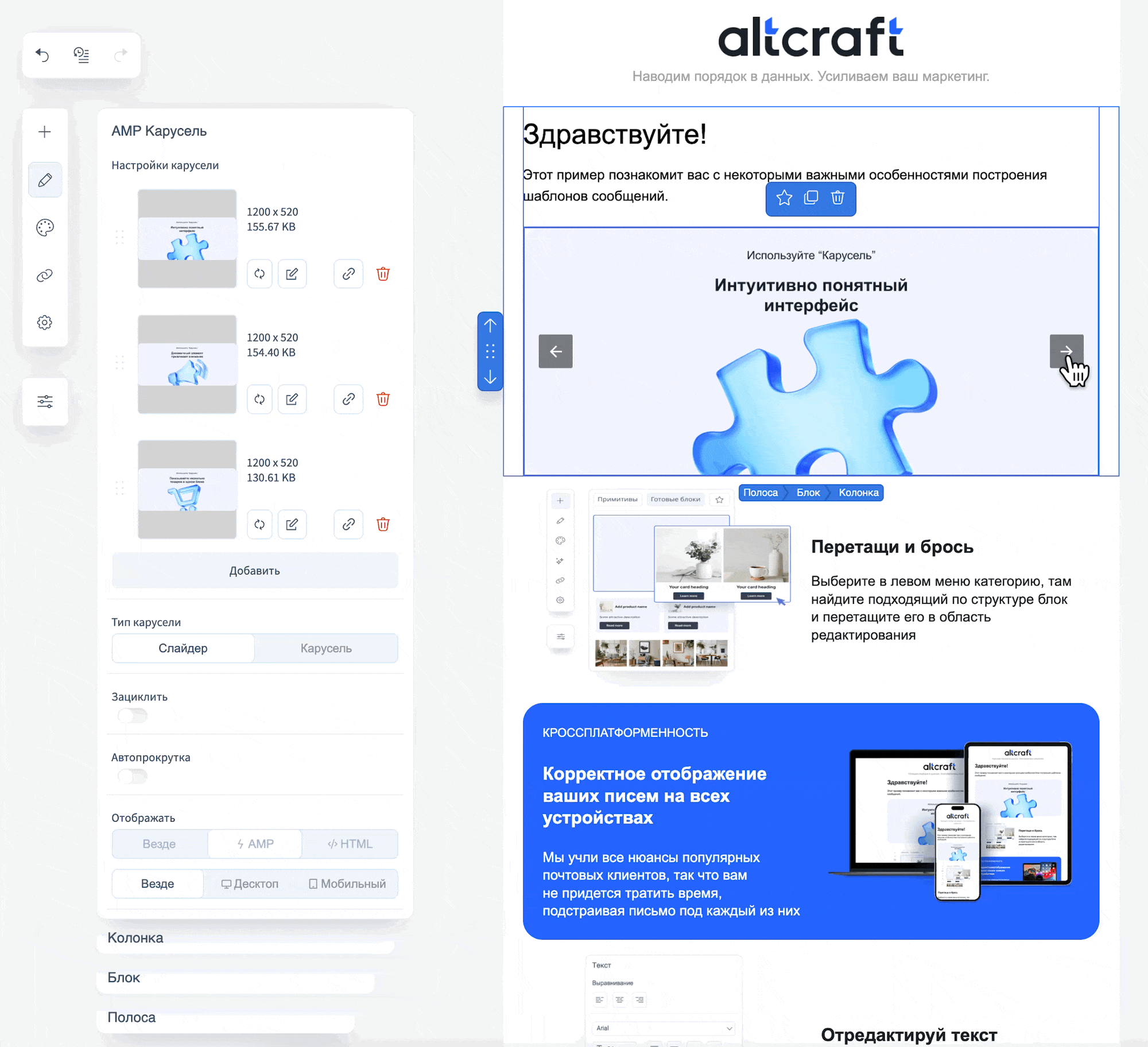 Отображение — определяет отображение блока в разных версиях письма (HTML/AMP/везде, десктоп/мобильное).