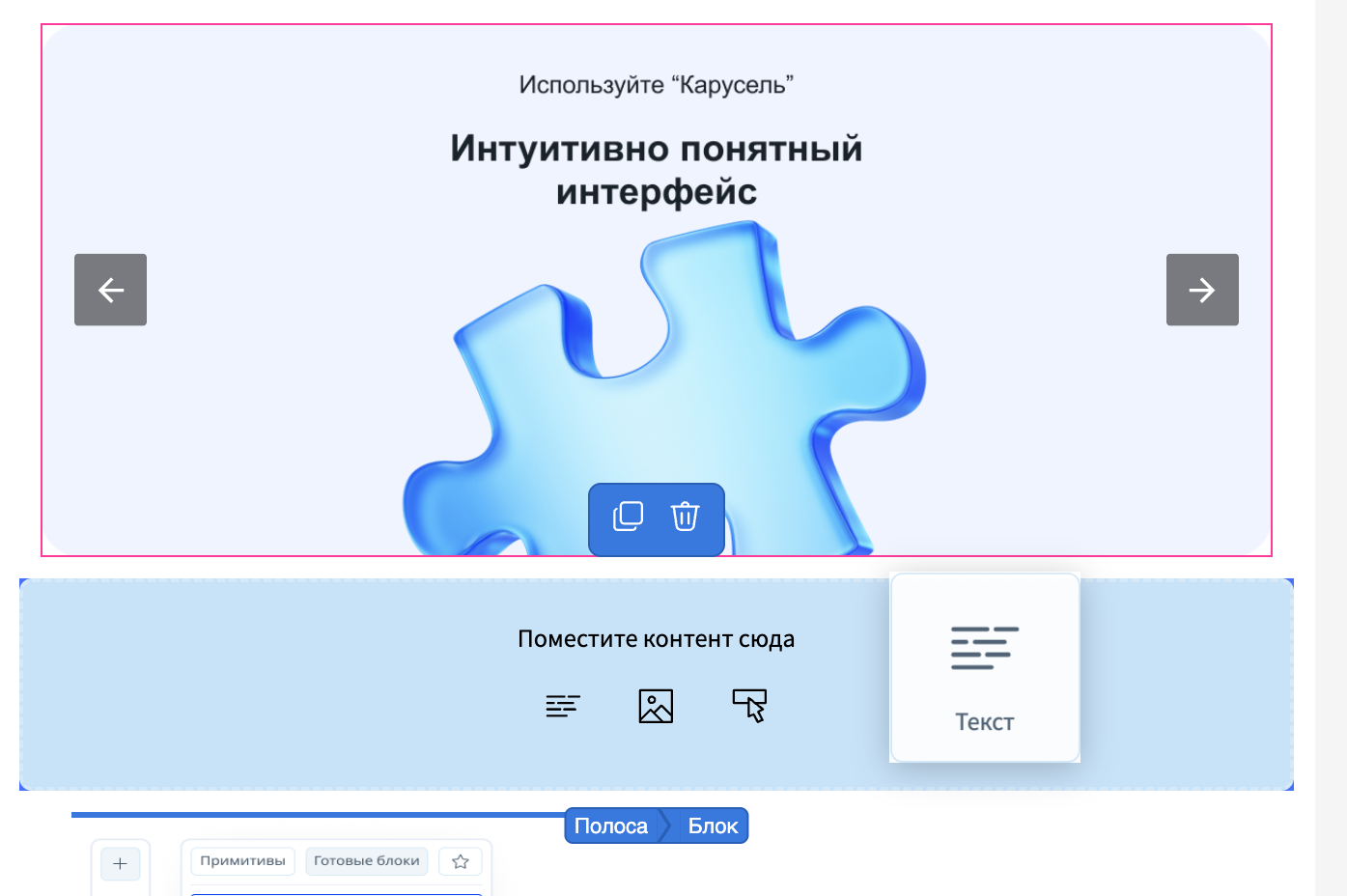 Вы можете добавить контент в пустой блок, нажав соответствующие иконки внутри элемента: