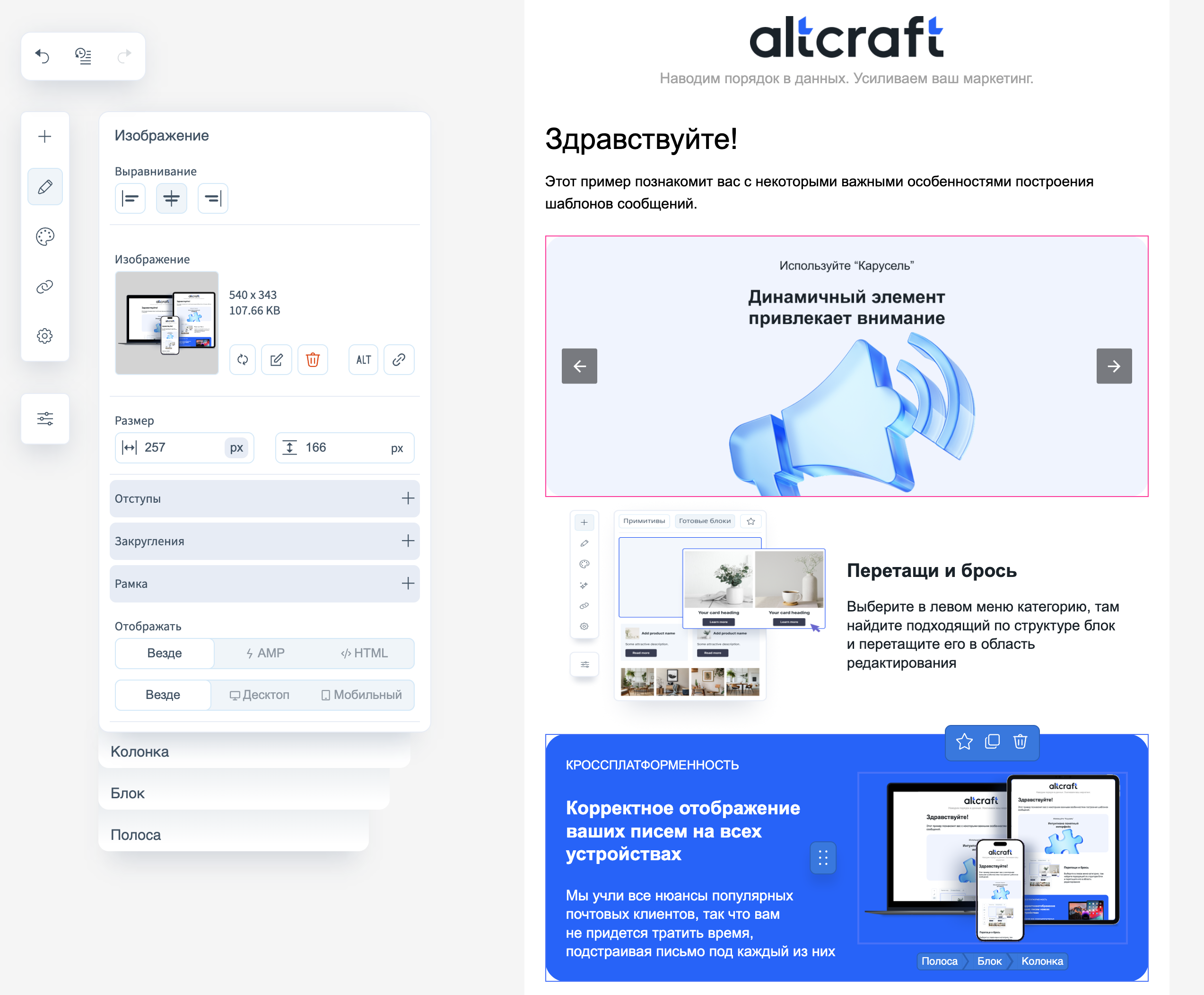 Главная часть редактора, где происходит сборка письма. Сюда можно перетаскивать блоки из рабочей панели. Каждый элемент подсвечивается границами и может быть изменён напрямую.