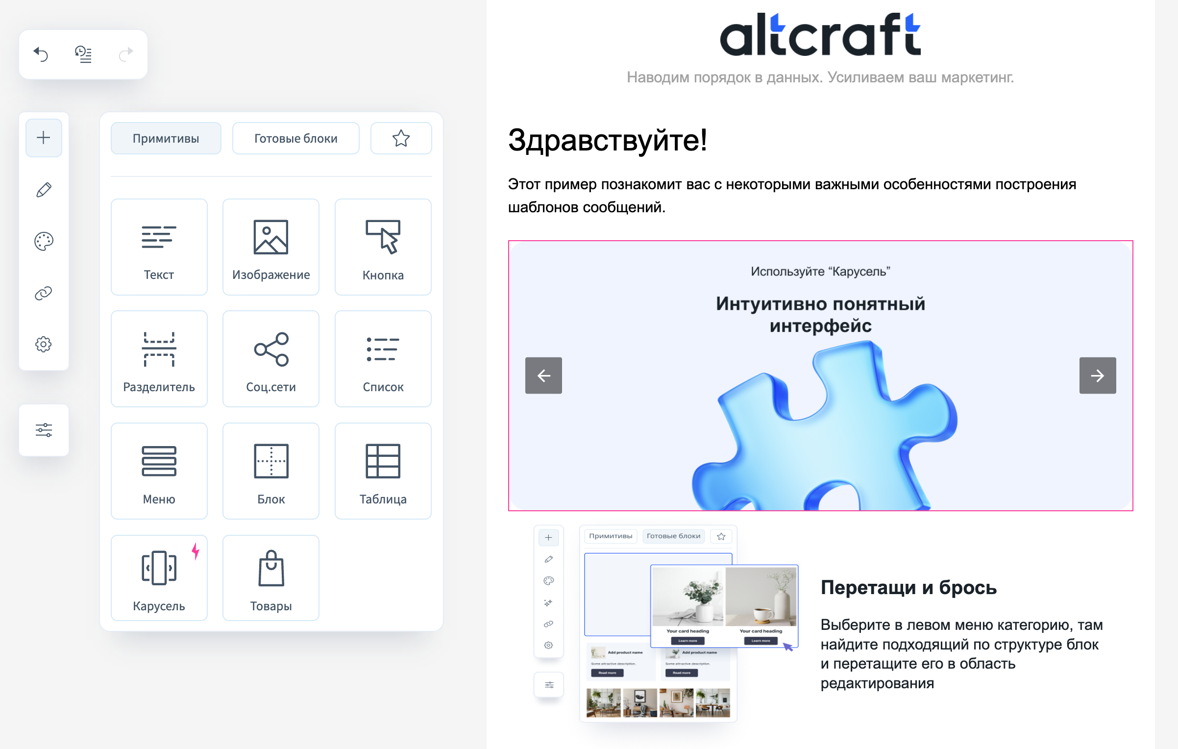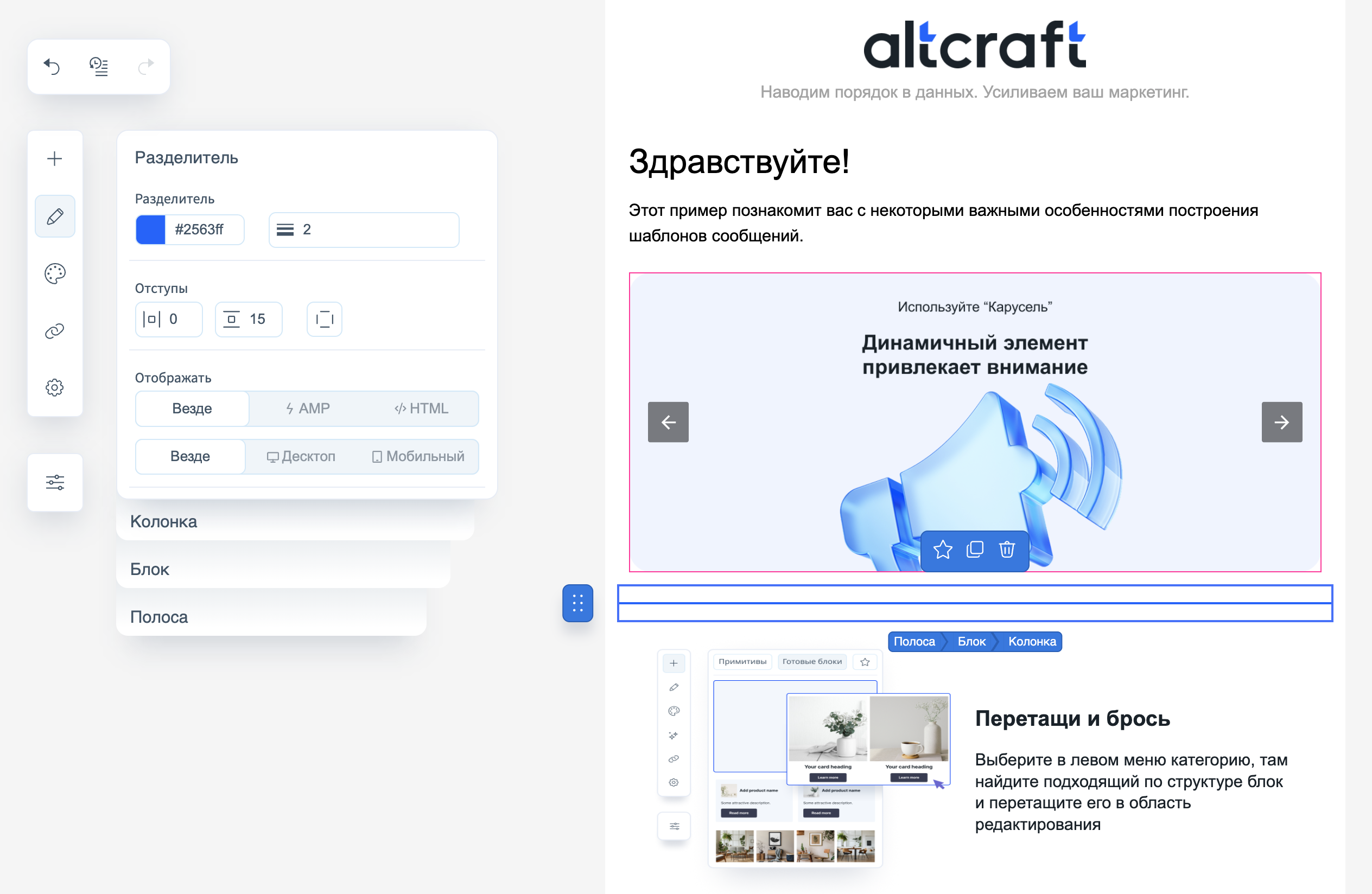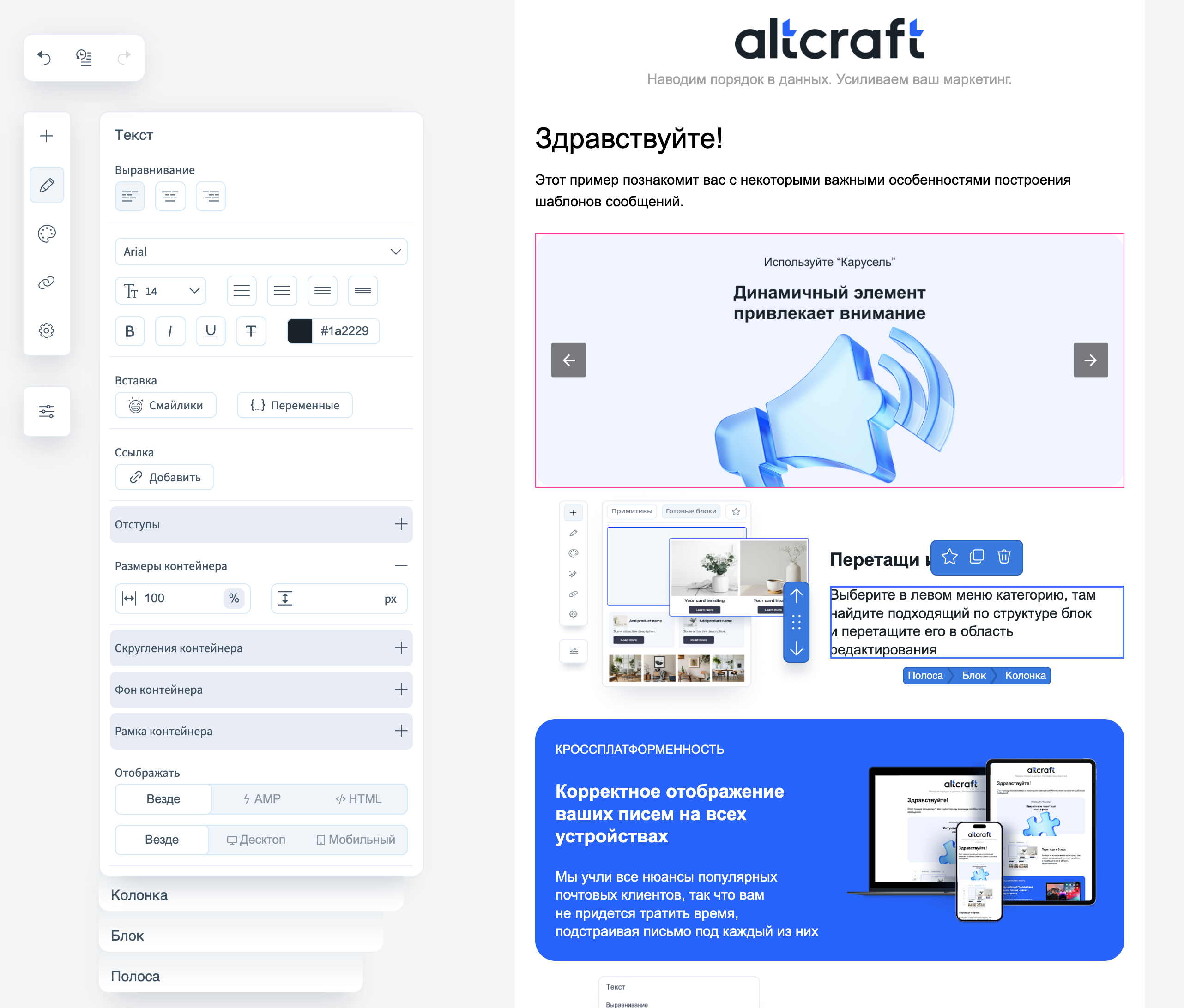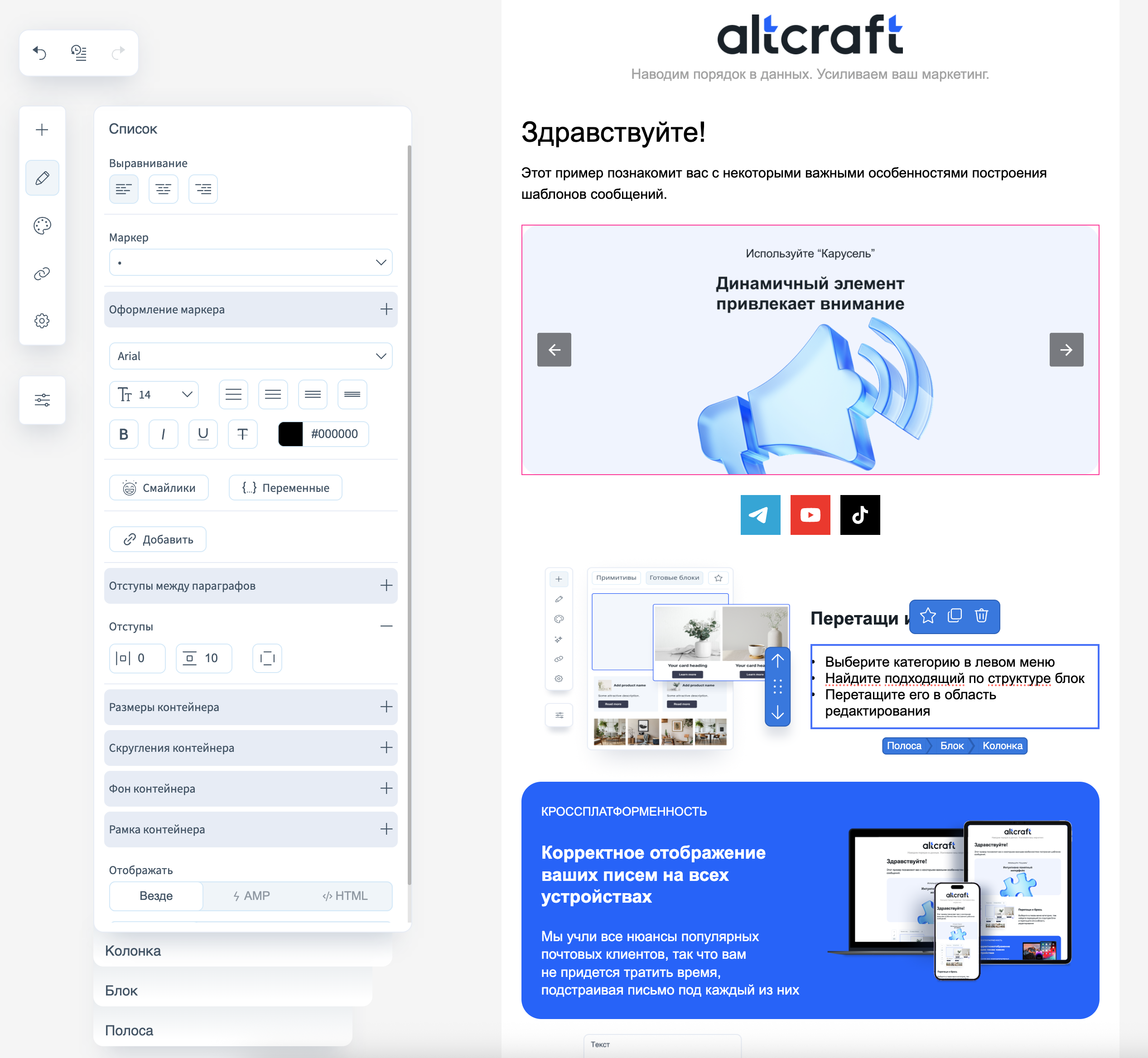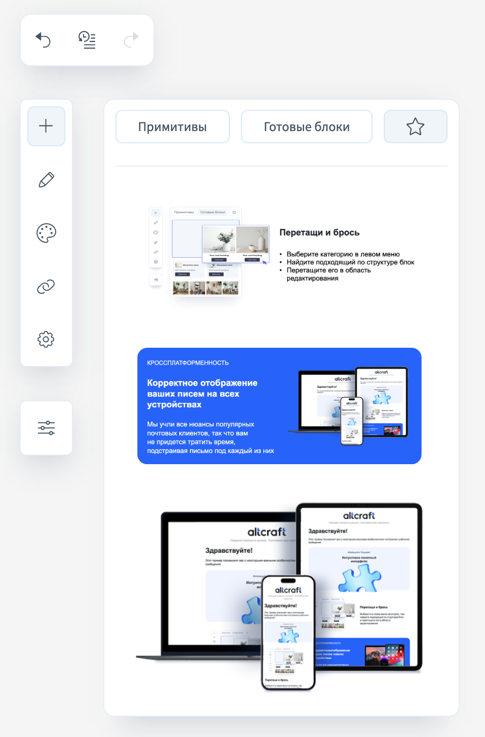 Блочный редактор для email-шаблона — это инструмент для создания, редактирования и настройки маркетинговых email—шаблонов и писем без необходимости написания кода. Он предназначен для маркетологов и дизайнеров, которые хотят быстро собирать профессиональные письма с помощью удобного интерфейса, используя блоки, визуальные элементы и настройки дизайна.