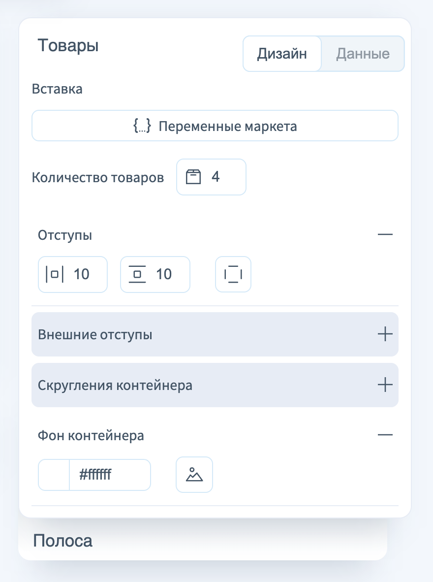 Вкладка Дизайн отвечает за визуальное оформление карточек товаров и содержит следующие свойства: