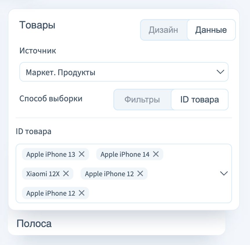 - ID товара — режим ручного выбора конкретных товаров по их идентификаторам. Подходит, если нужно отобразить фиксированные позиции, не зависящие от обновлений ассортимента.