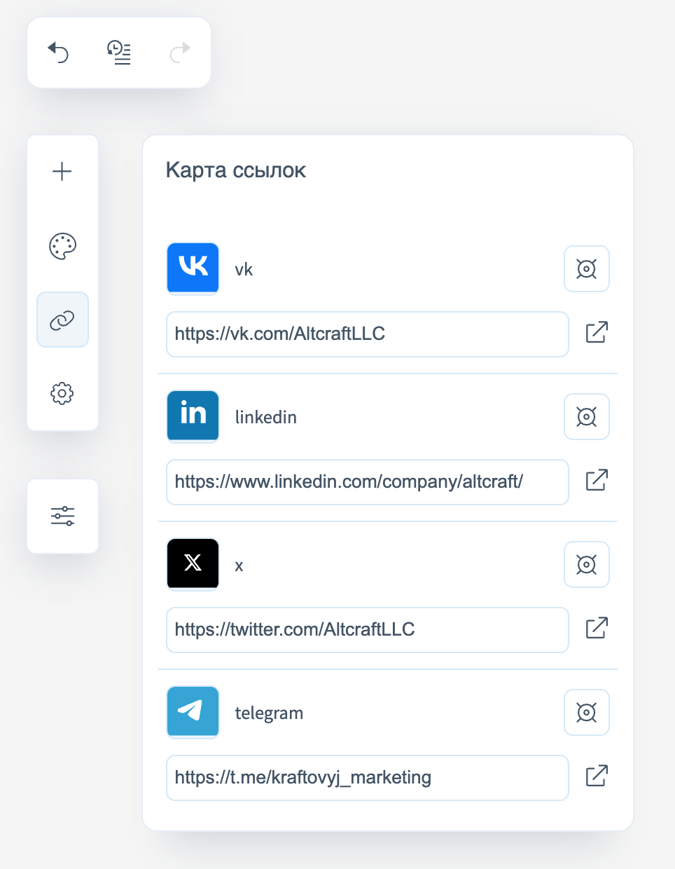 - Карта ссылок — отображает все ссылки, используемые в шаблоне, для проверки и редактирования;