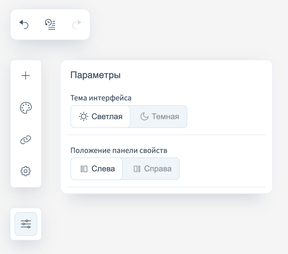 - Параметры — общие параметры редактора (тема интерфейса и положение панели свойств).