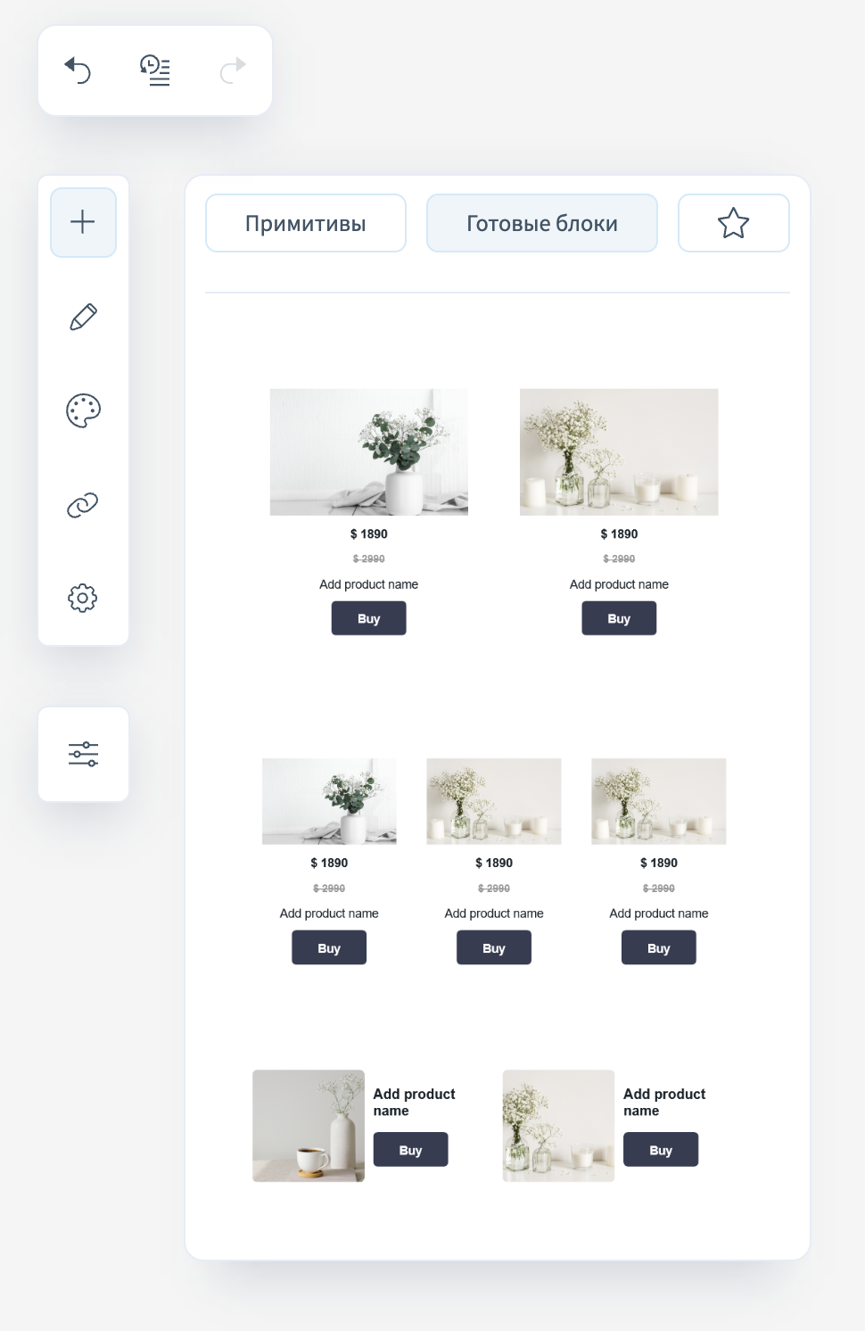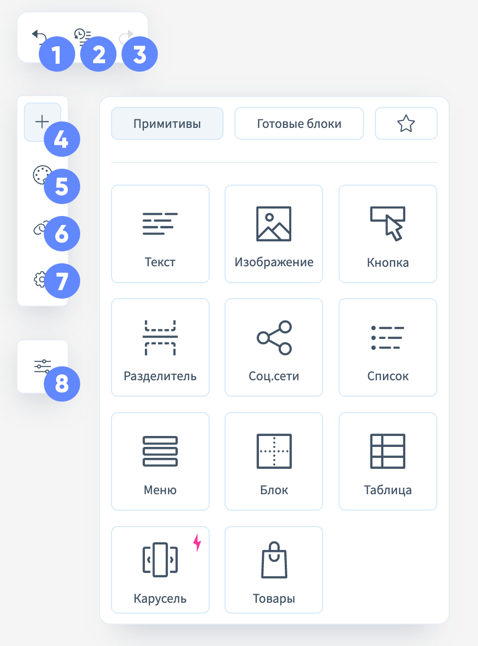 - Добавить — открывает меню примитивов и готовых блоков для вставки в шаблон;