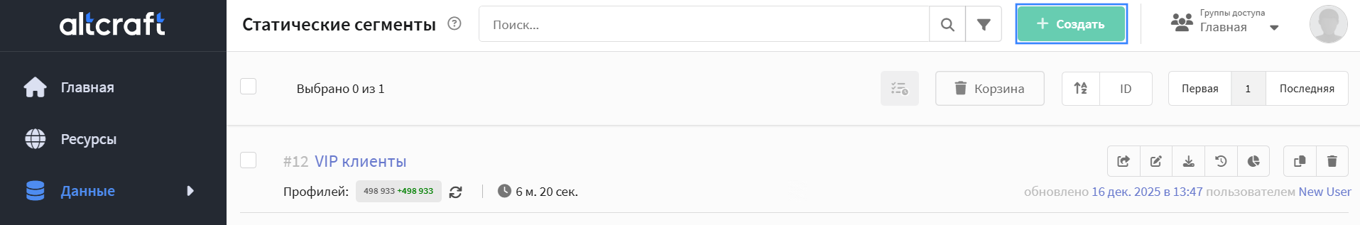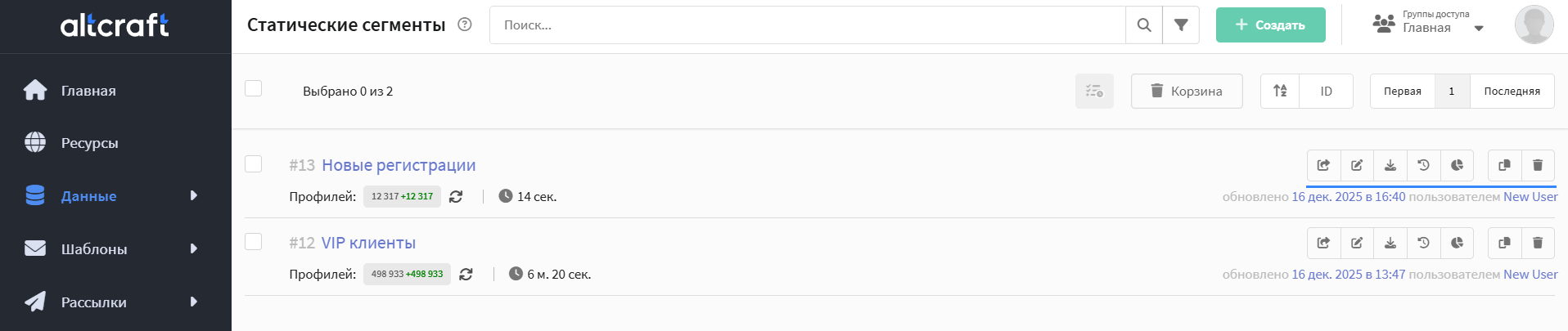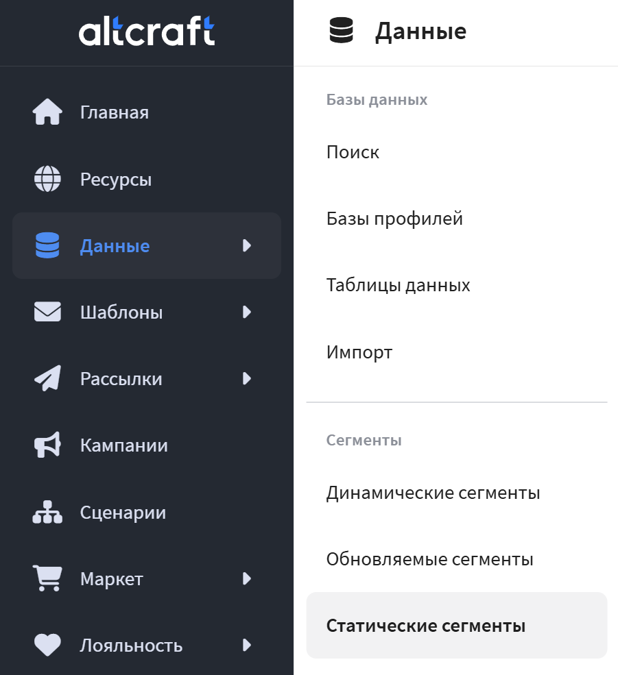 ![]() | Чтобы начать работу, перейдите в раздел Данные — Сегменты — Статические сегменты. |