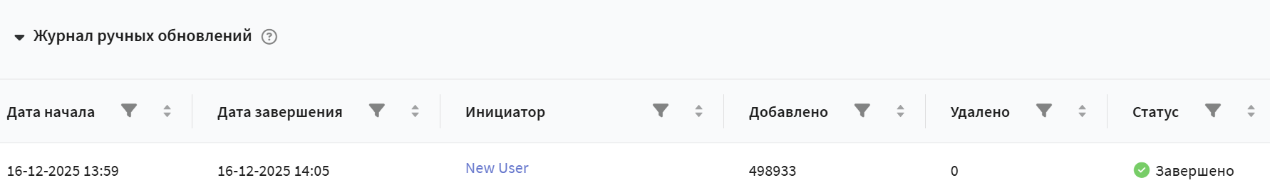 Ниже истории обновлений находится "Журнал ручных изменений". Это детальный лог всех операций, повлиявших на состав сегмента. По каждой операции отображается: