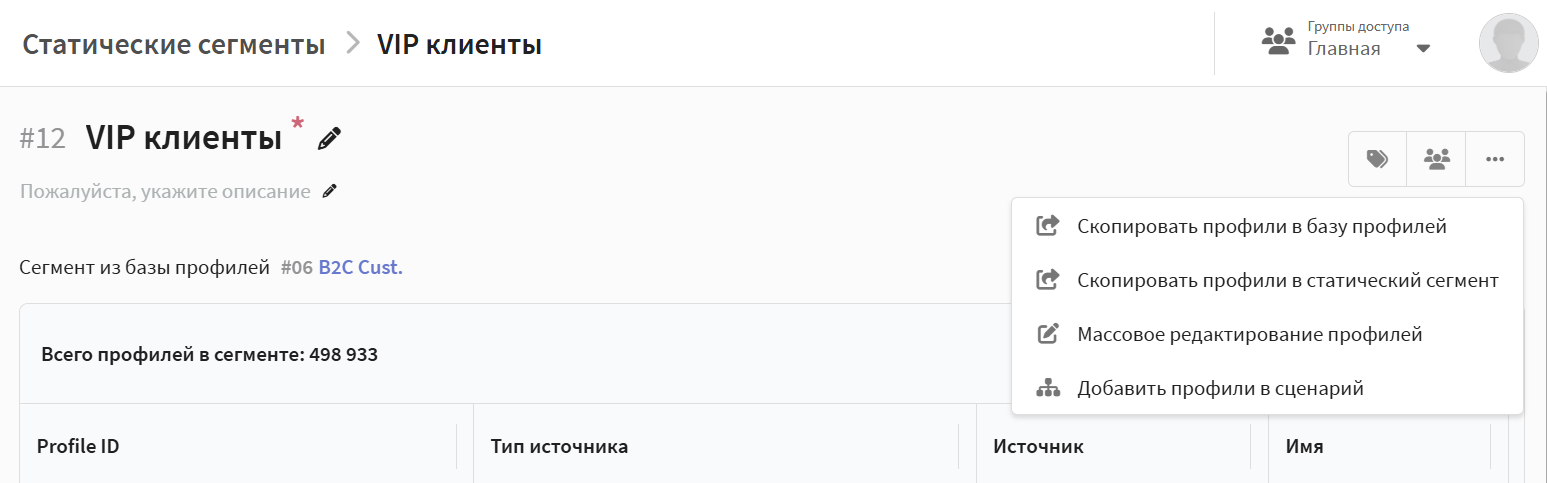 После создания или выбора сегмента откроется его редактор. В правом верхнем углу редактора сегмента доступна панель действий для работы со всем текущим списком профилей: