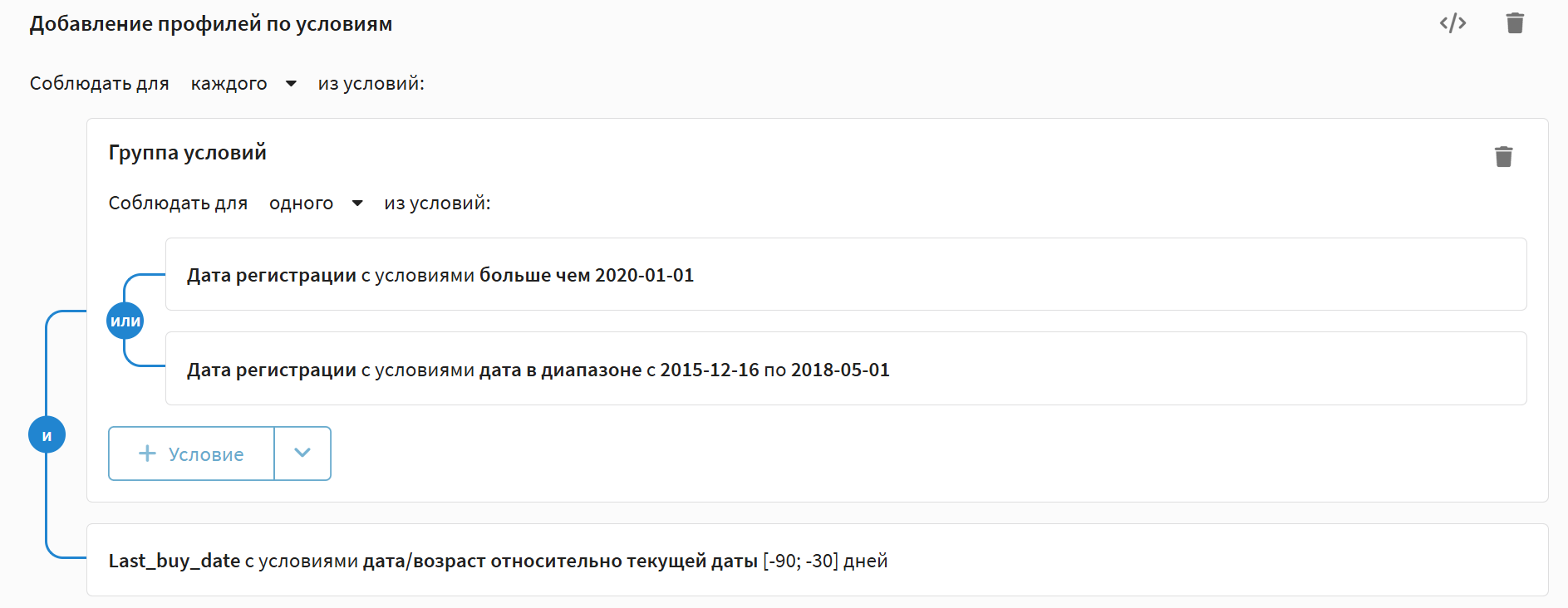 Внутри группы условия могут работать по логике "И" (соблюдать для каждого условия) или "ИЛИ" (соблюдать для одного из условий):
