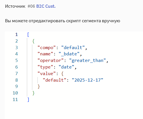 Запрос сегментации можно также составлять вручную, с помощью встроенного редактора JSON. Для этого нажмите в запросе кнопку Скрипт: