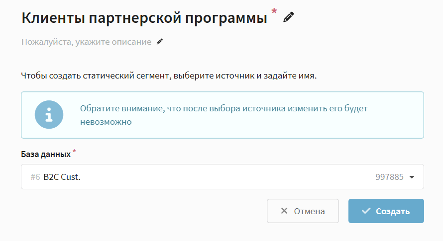 В открывшейся форме укажите Имя и Описание сегмента, а также выберите Базу данных (БД), из которой будут отбираться профили. Затем нажмите Создать: