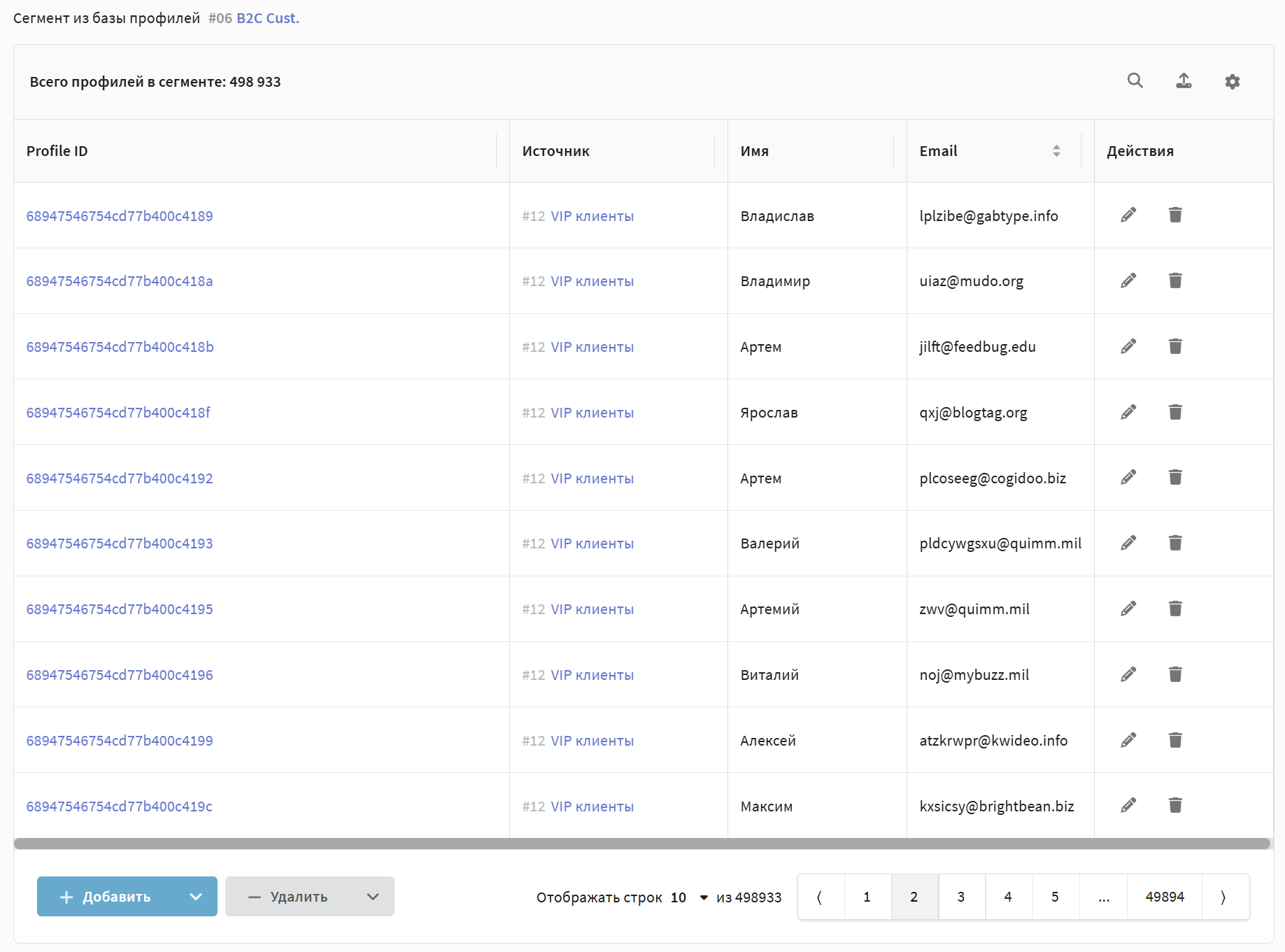 После расчета в окне статического сегмента отображается таблица со всеми профилями, входящими в сегмент. Помимо данных профиля, в таблице отображаются системные поля, такие как "Тип источника" (например, импорт, условия) и "Источник добавления" (идентификатор сегмента или рассылки). Эти поля помогают отследить историю попадания каждого профиля в сегмент.